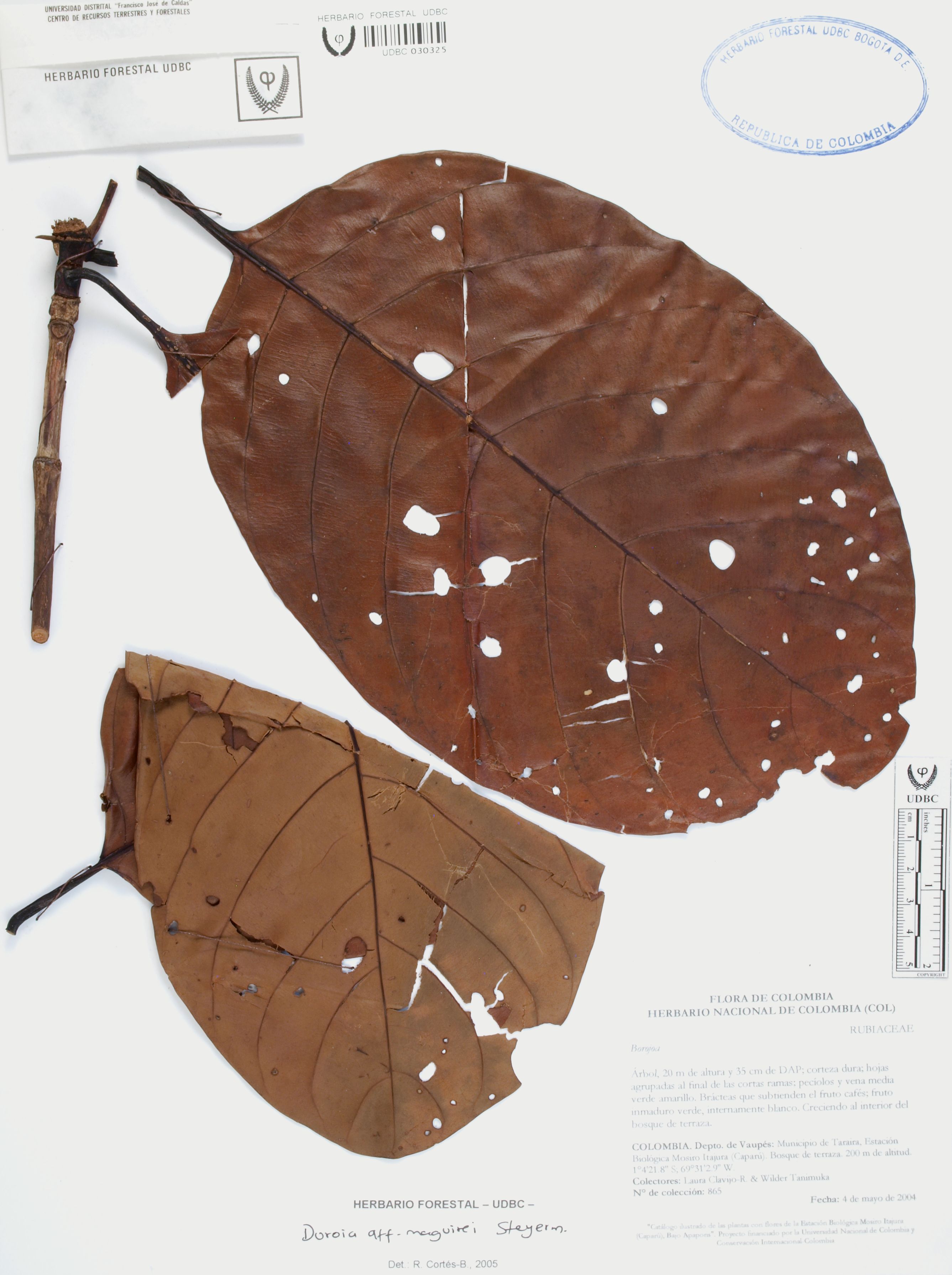 Fotografía del ejemplar Clavijo-R., L. 865, determinado como Duroia maguirei en el año 2005