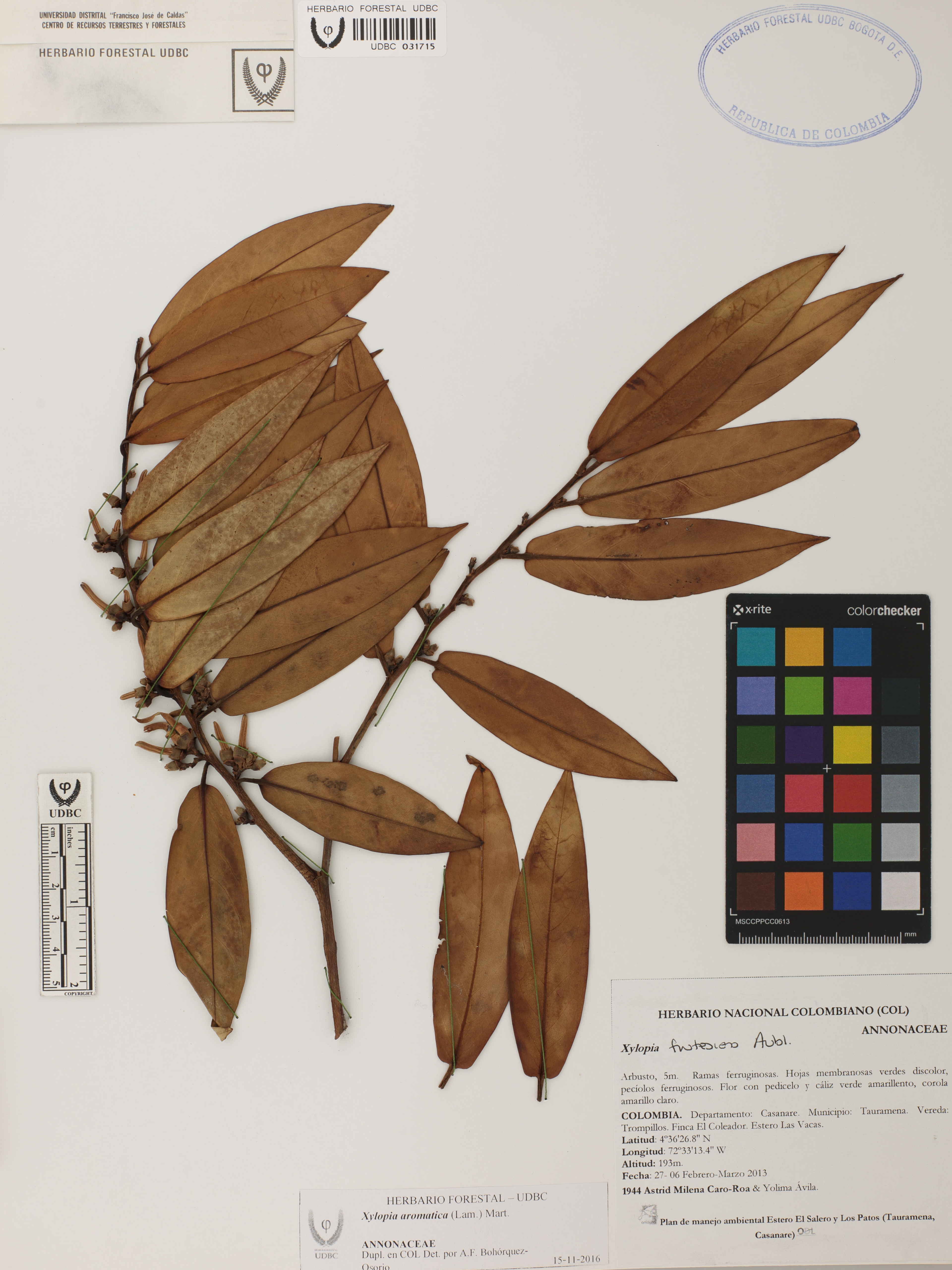 | dc.description | Fotografía del ejemplar Caro-Roa, A. 1944, determinado como Xylopia aromatica en el año 2016 | |