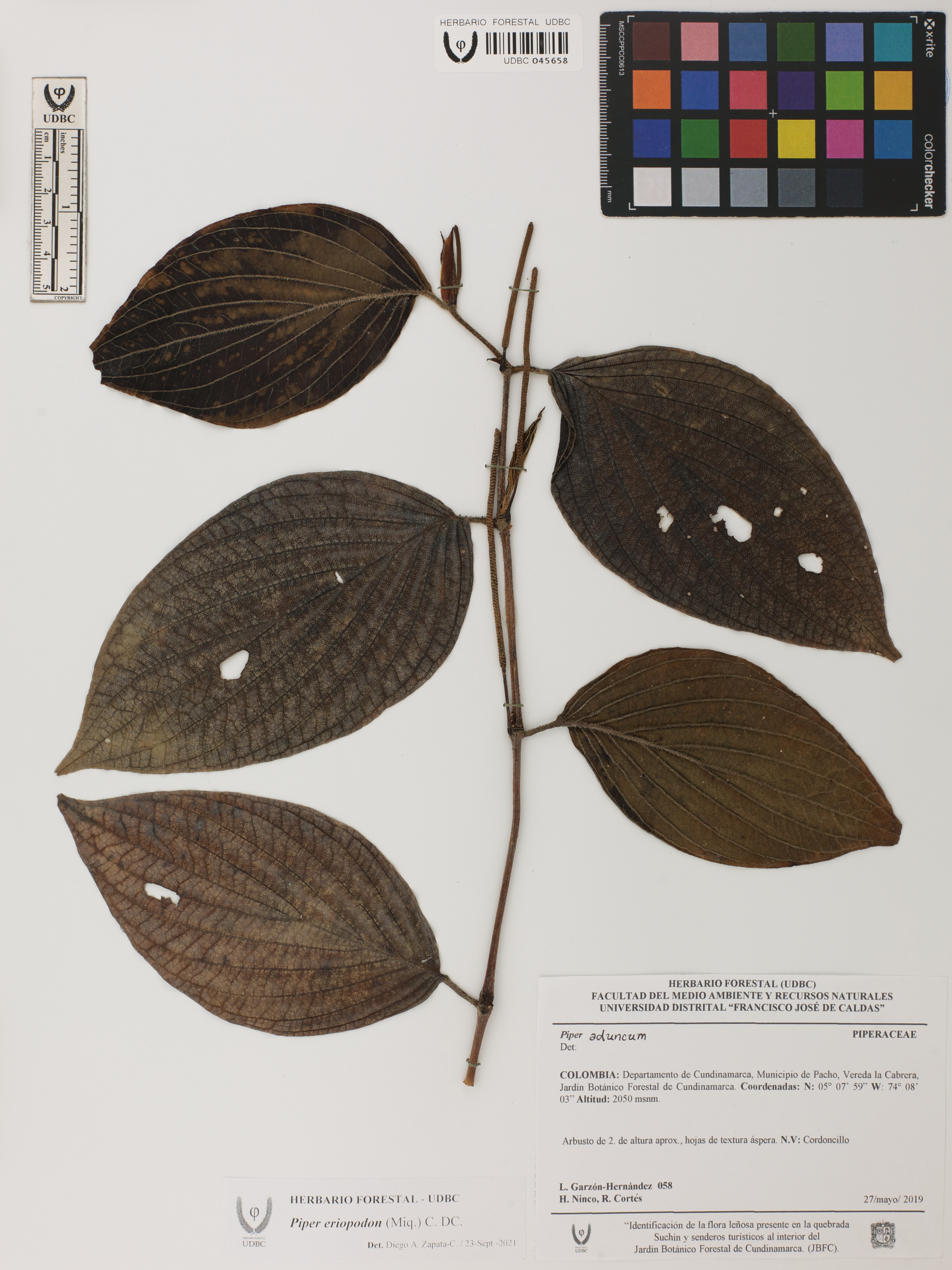 Fotografía del ejemplar Garzón-Hernández, L. 58, determinado como Piper eriopodon en el año 2021