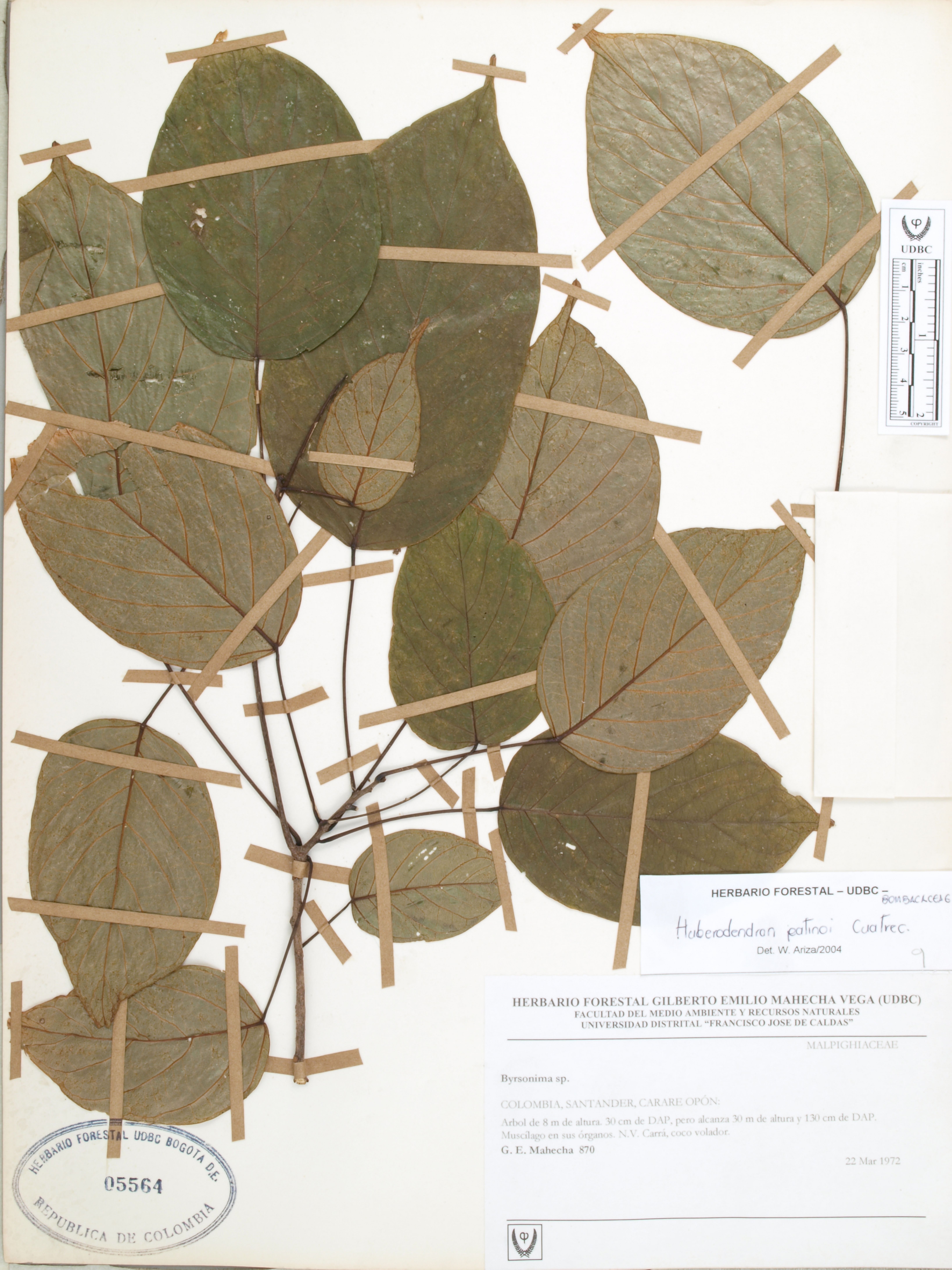 Fotografía del ejemplar Mahecha, G. 870, determinado como Huberodendron patinoi en el año 2004