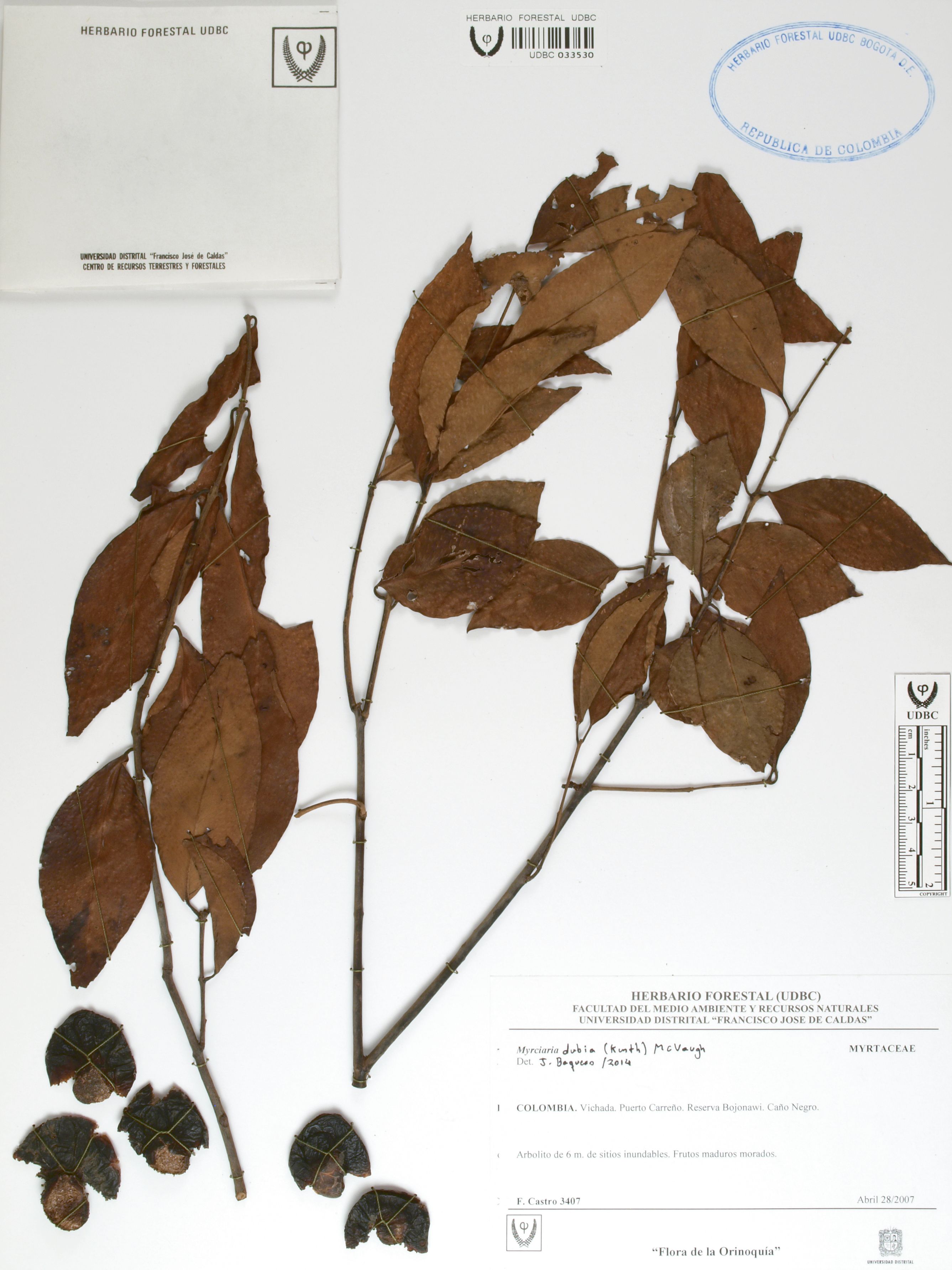 Fotografía del ejemplar Castro, F. 3407, determinado como Myrciaria dubia en el año 2014