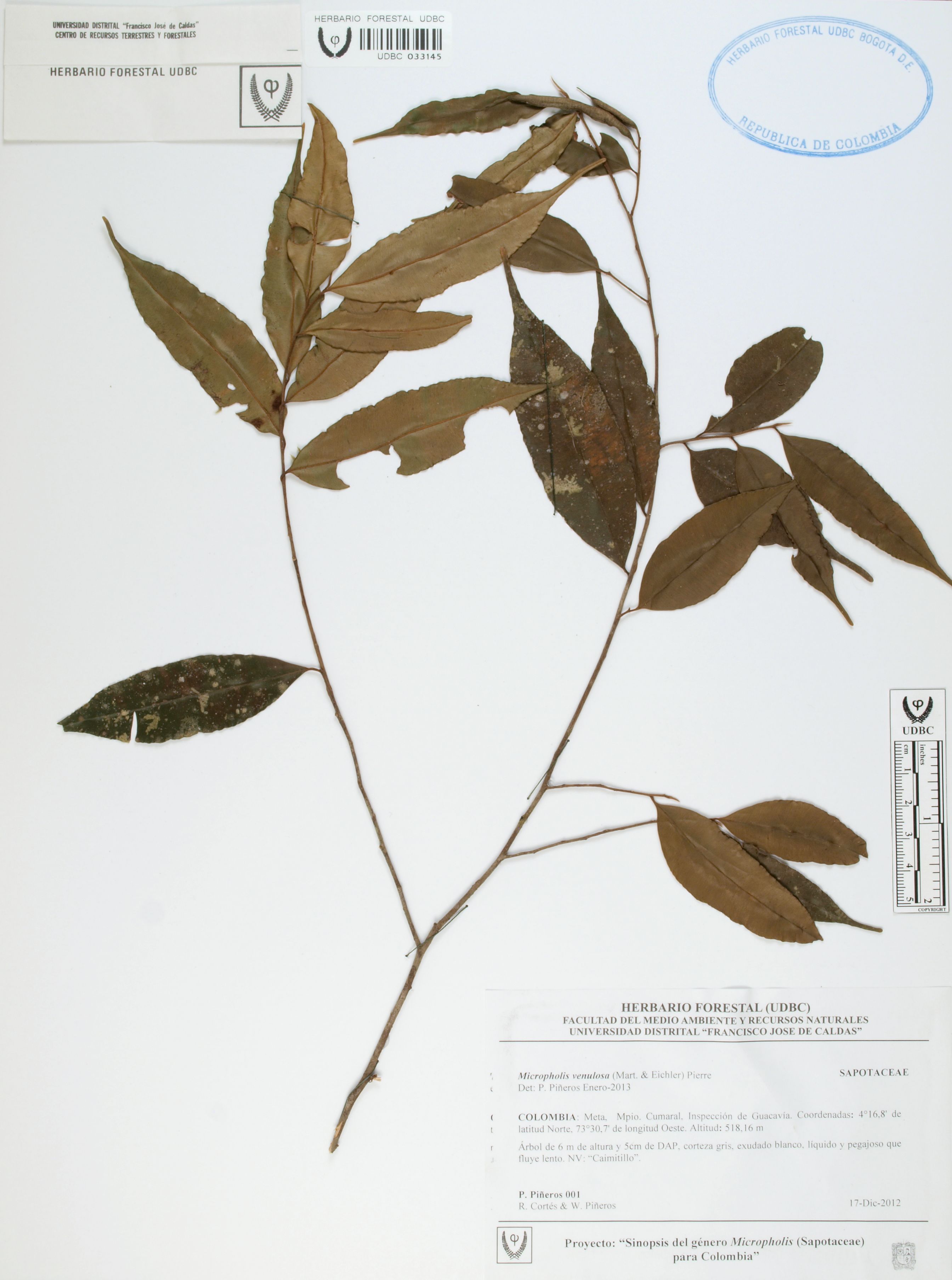 Fotografía del ejemplar Piñeros, P. 1, determinado como Micropholis venulosa en el año 2013