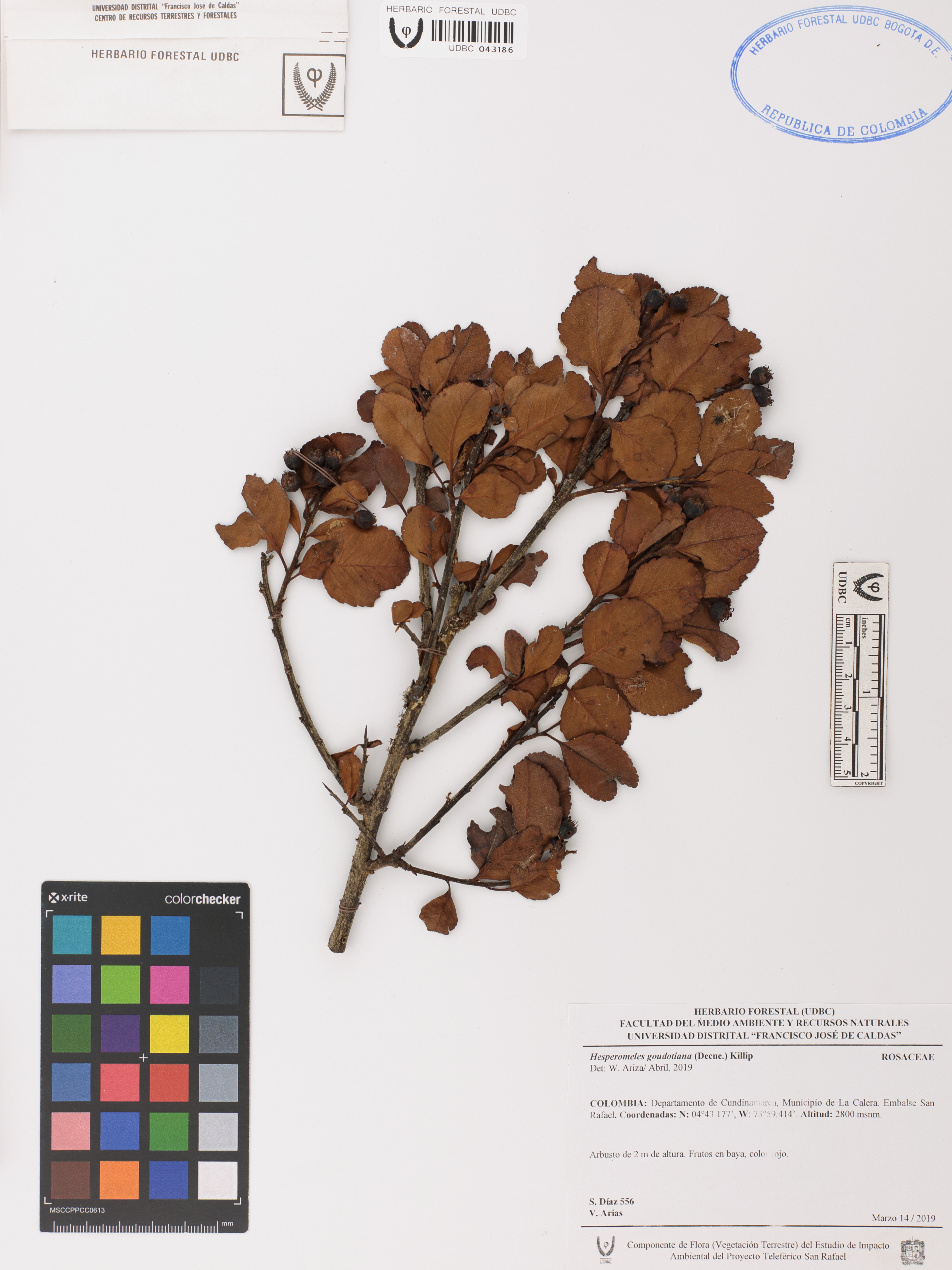 Fotografía del ejemplar Díaz, S. 556, determinado como Hesperomeles goudotiana en el año 2019