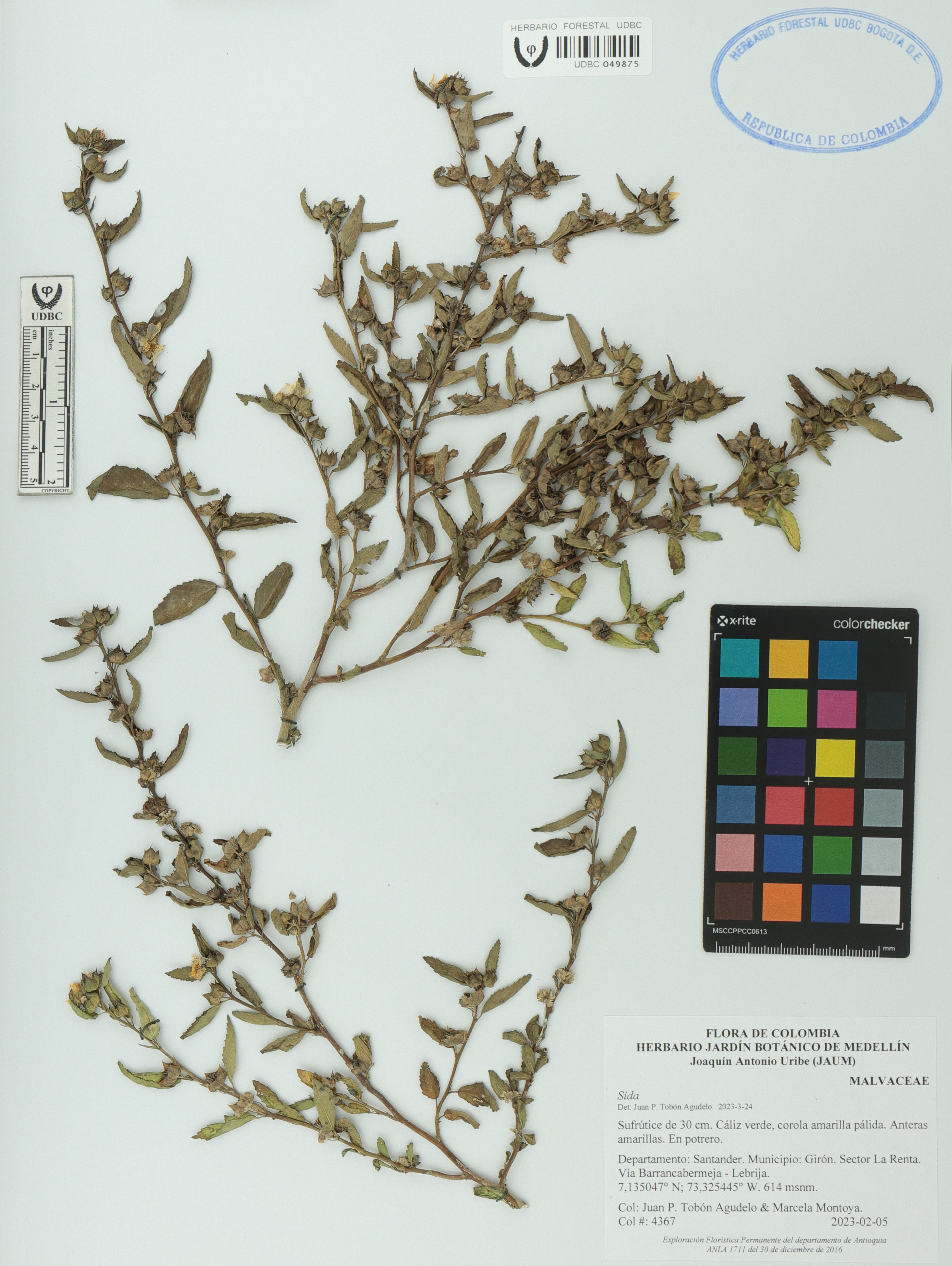Fotografía del ejemplar Tobón-A., J. 4367, determinado como Sida sp. en el año 2023