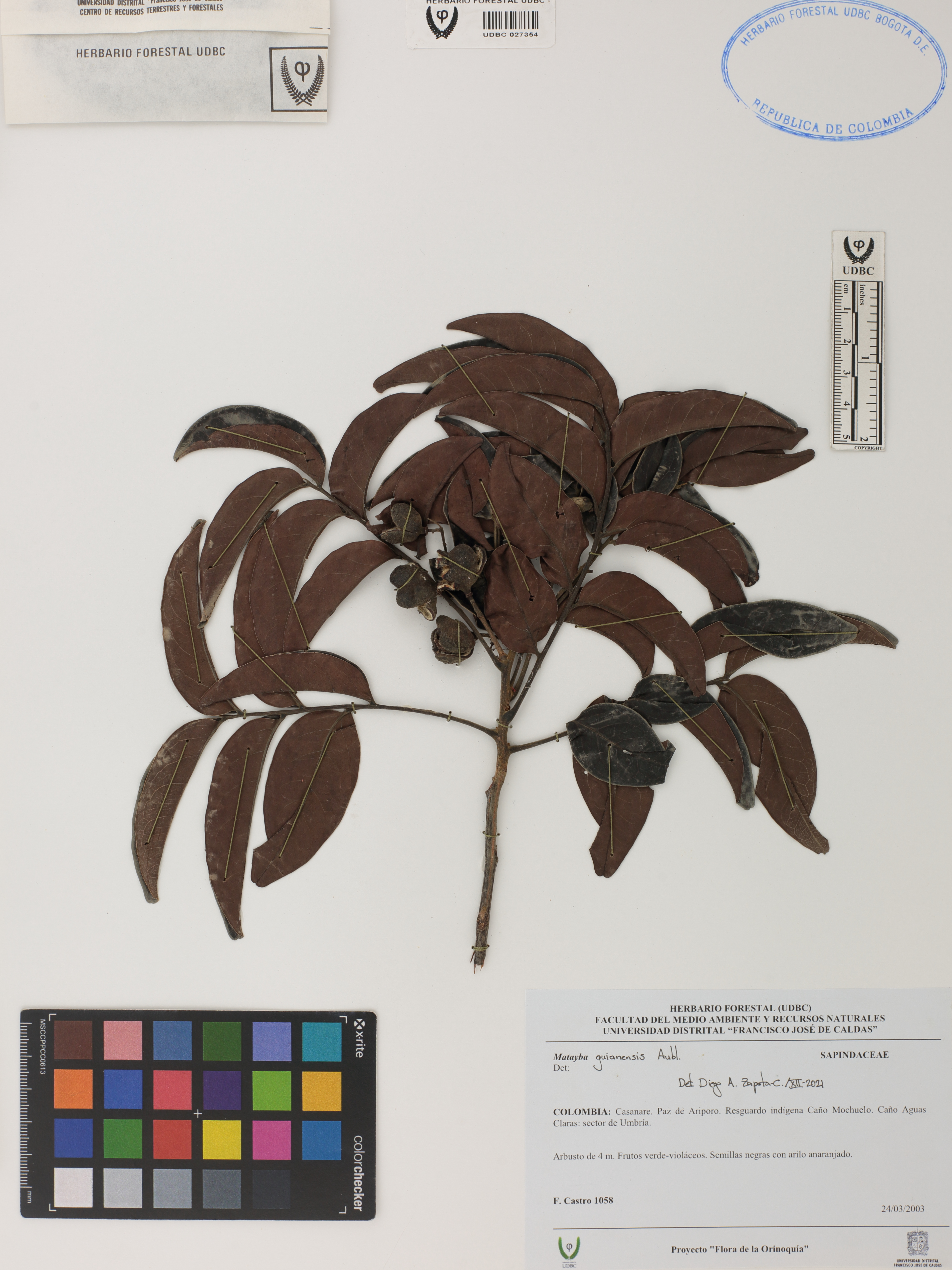 Fotografía del ejemplar Castro, F. 1058, determinado como Matayba guianensis en el año 2021