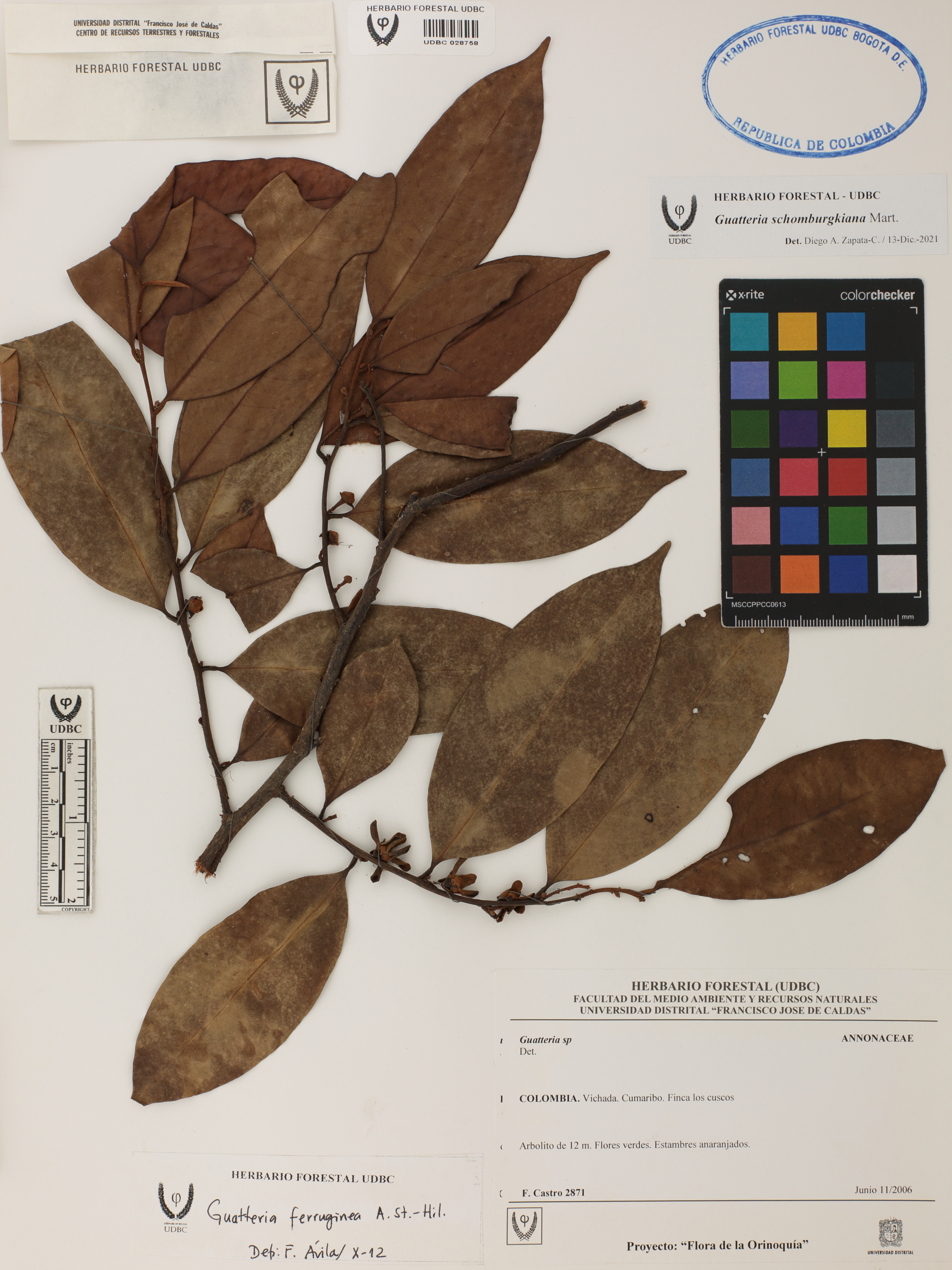 Fotografía del ejemplar Castro, F. 2871, determinado como Guatteria schomburgkiana en el año 2021