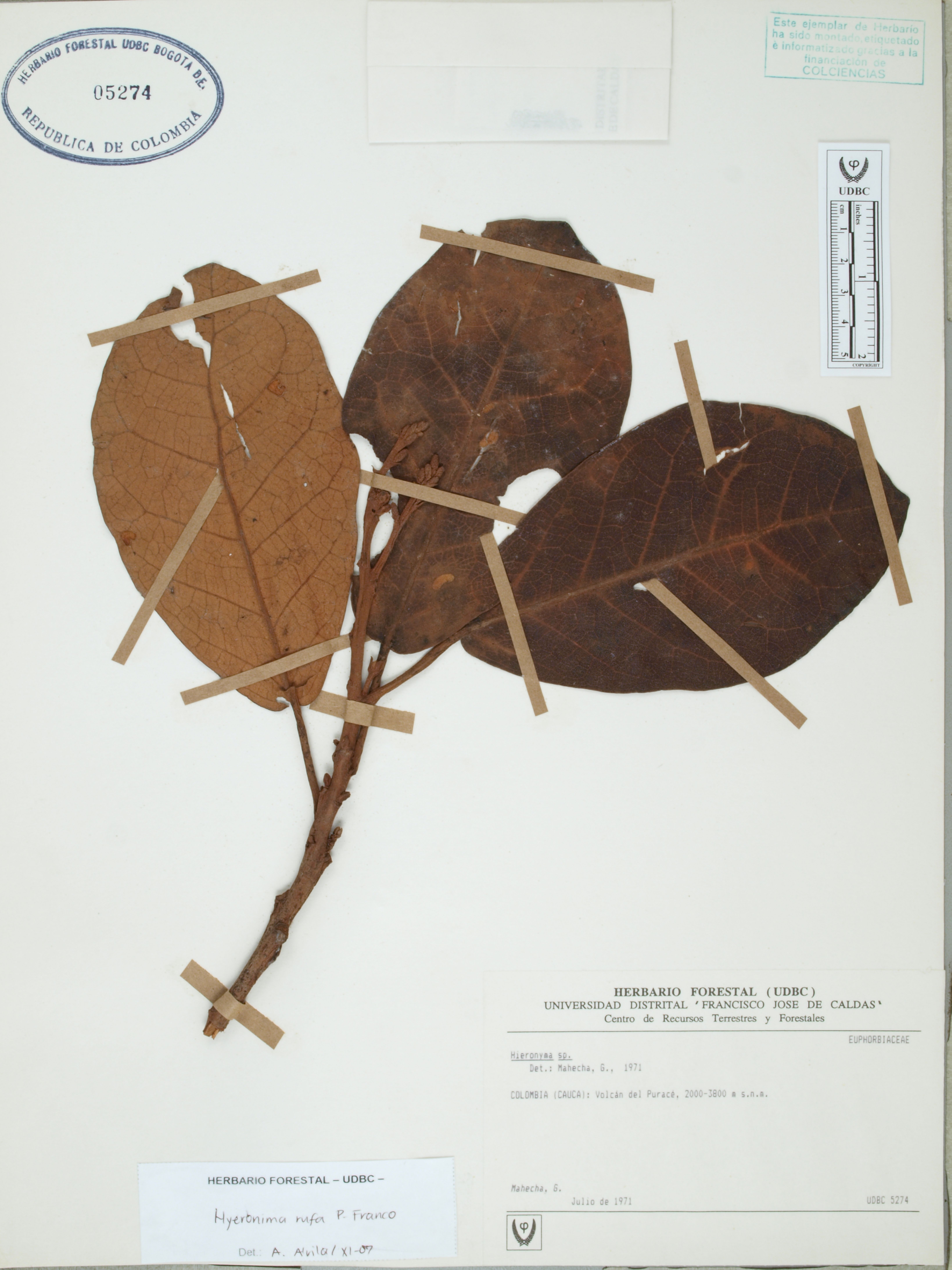 Fotografía del ejemplar Mahecha, G., determinado como Hieronyma rufa en el año 2007