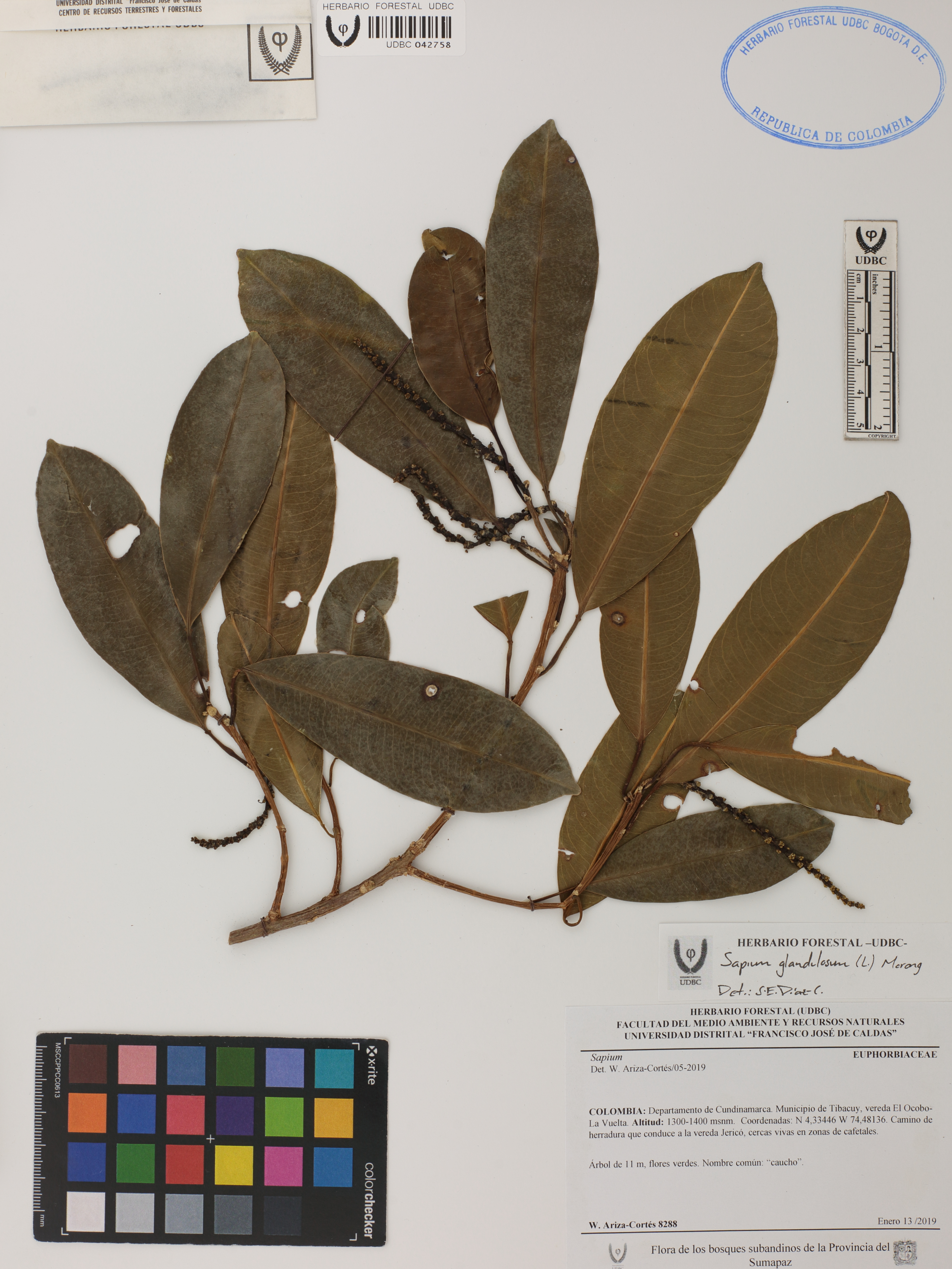 Fotografía del ejemplar Ariza-C., W. 8288, determinado como Sapium glandulosum en el año 2022
