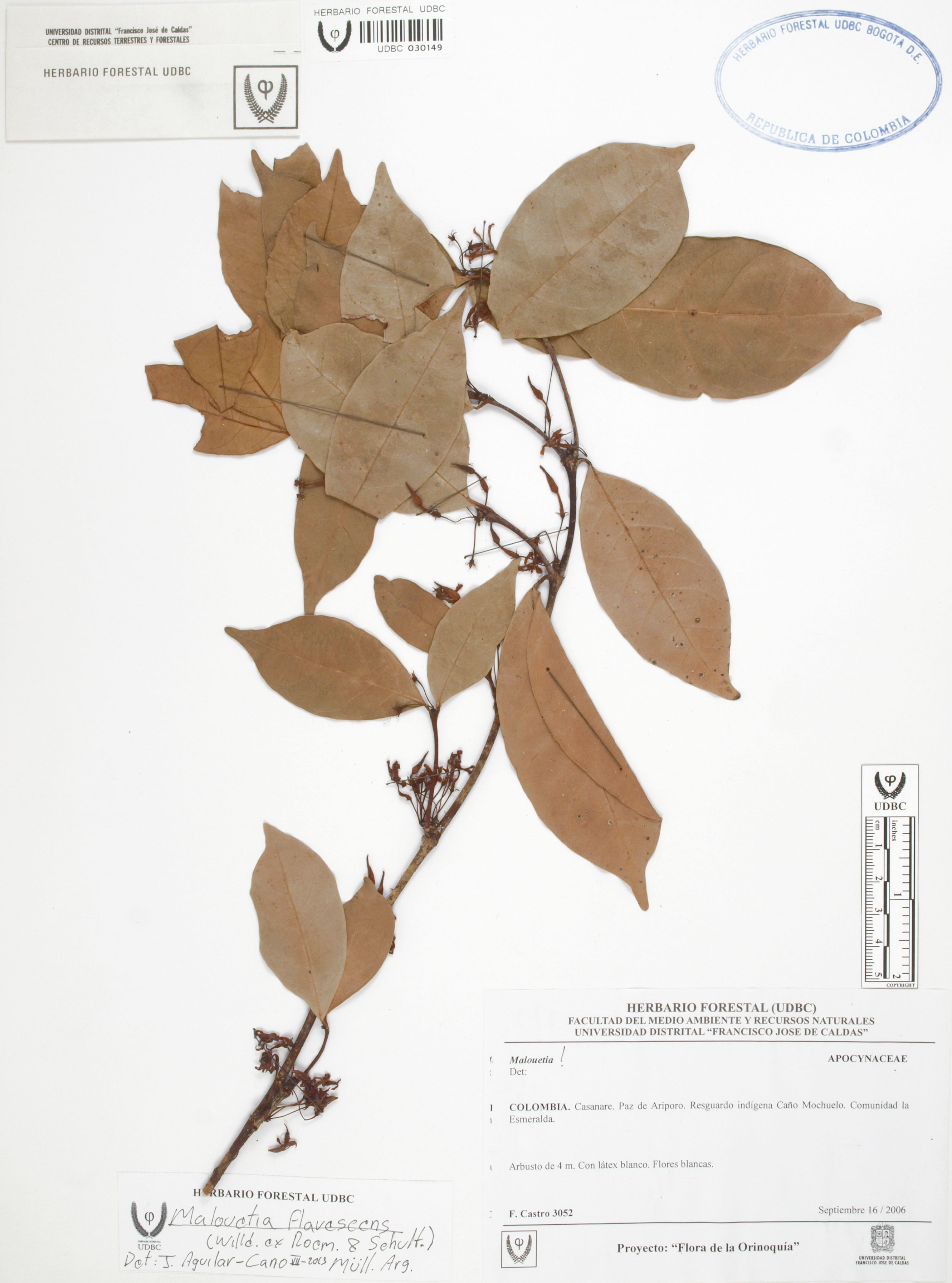 Fotografía del ejemplar Castro, F. 3052, determinado como Malouetia flavescens en el año 2013