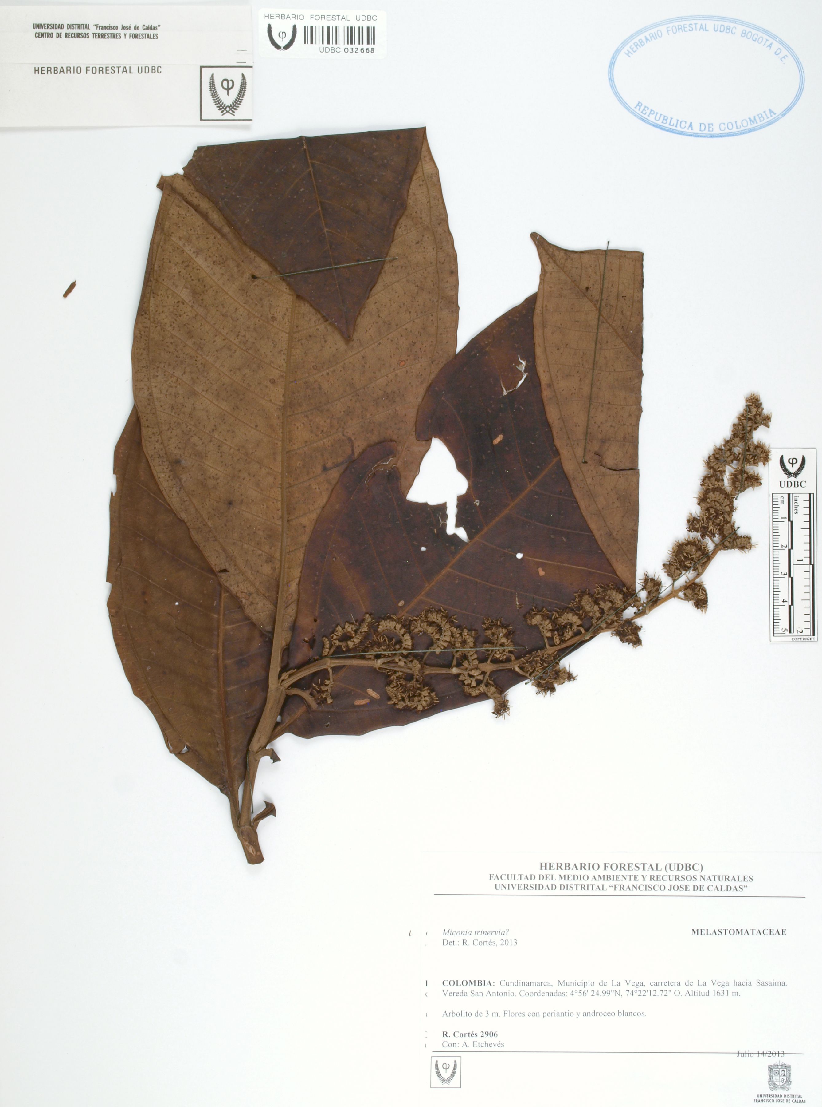 Fotografía del ejemplar Cortés, R. 2906, determinado como Miconia trinervia en el año 2013