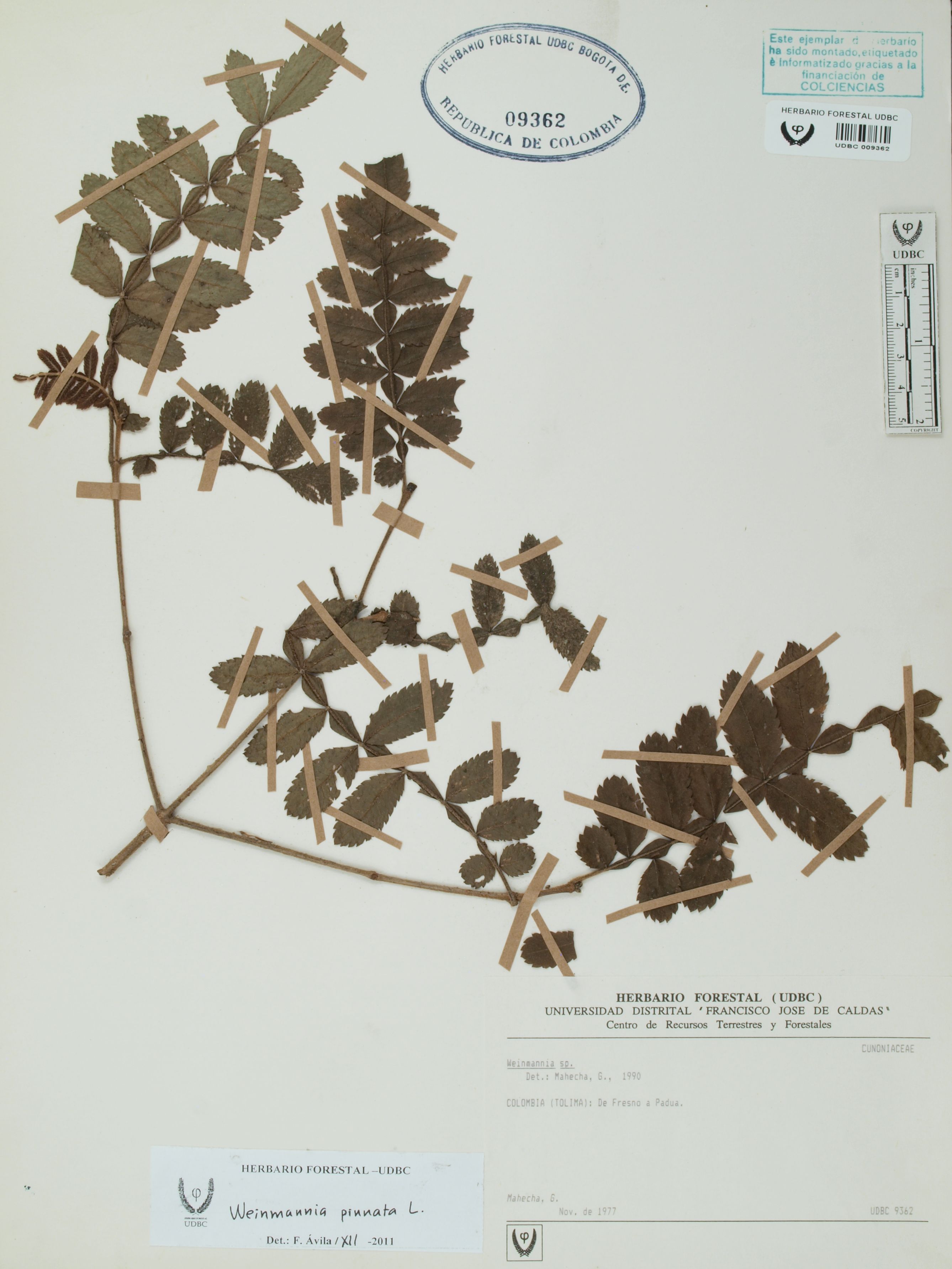 Fotografía del ejemplar Mahecha, G., determinado como Weinmannia pinnata en el año 2011