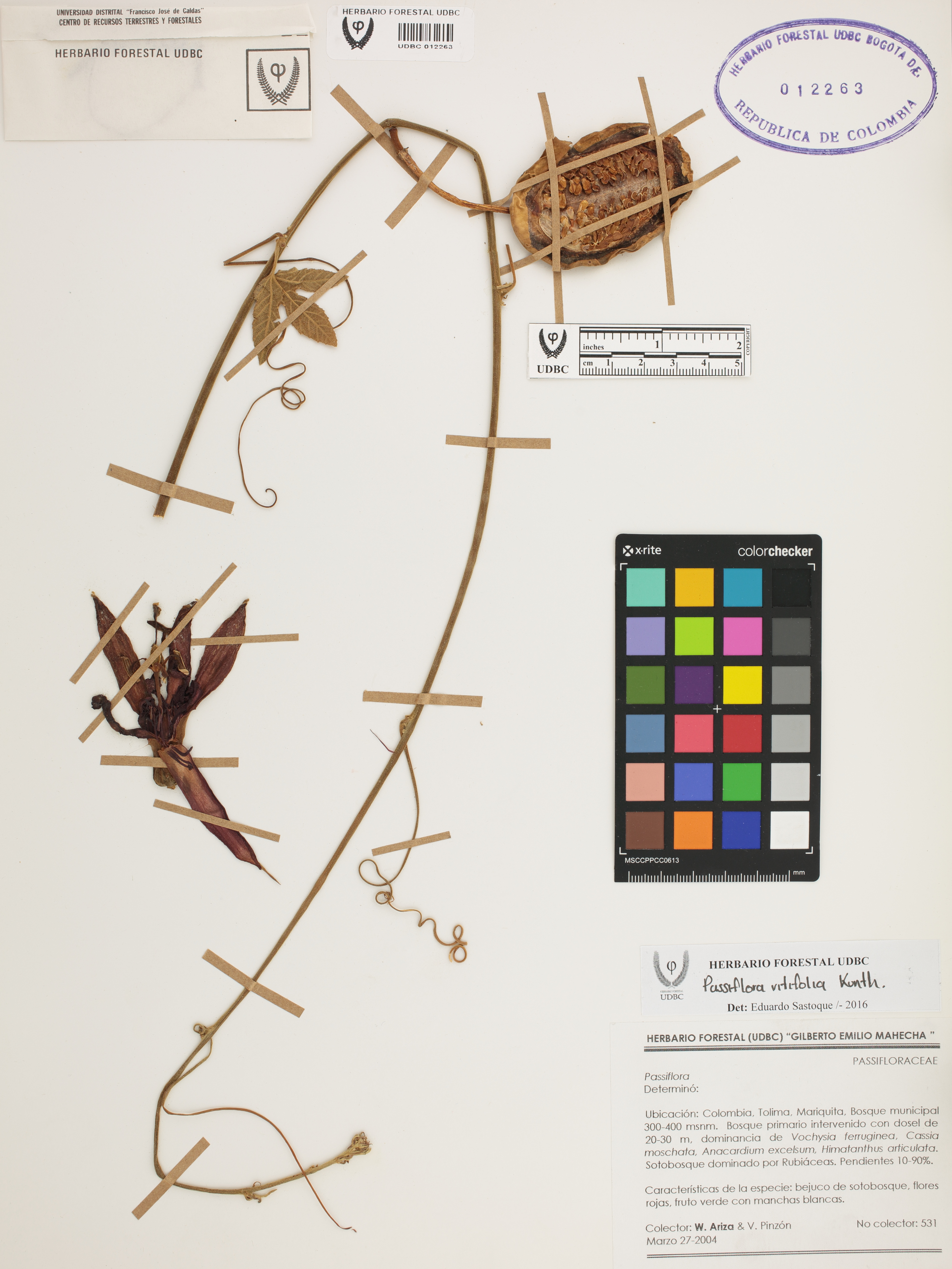 Fotografía del ejemplar Ariza, W. 531, determinado como Passiflora vitifolia en el año 2016