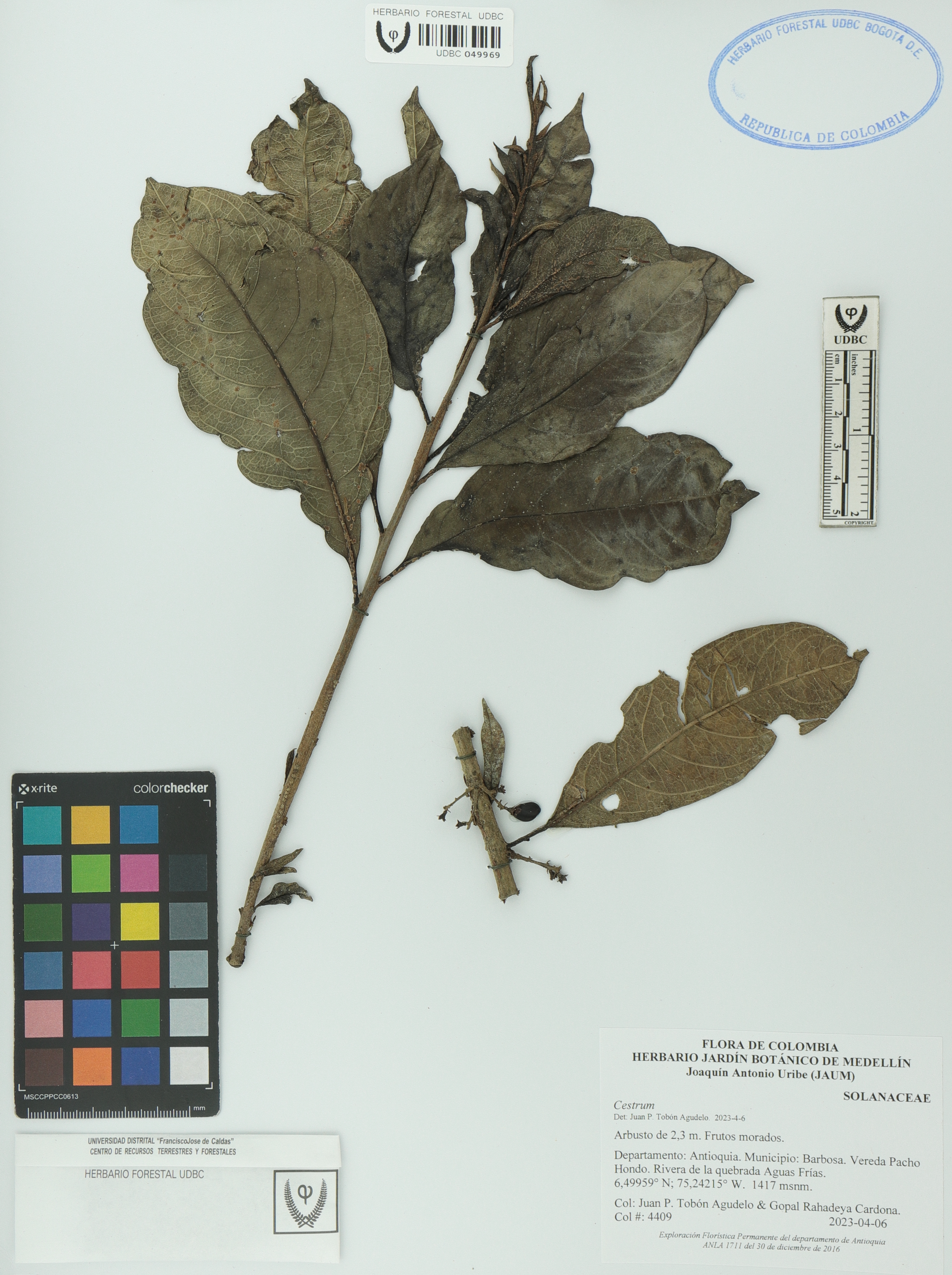 Fotografía del ejemplar Tobón-A., J. 4409, determinado como Cestrum sp. en el año 2023