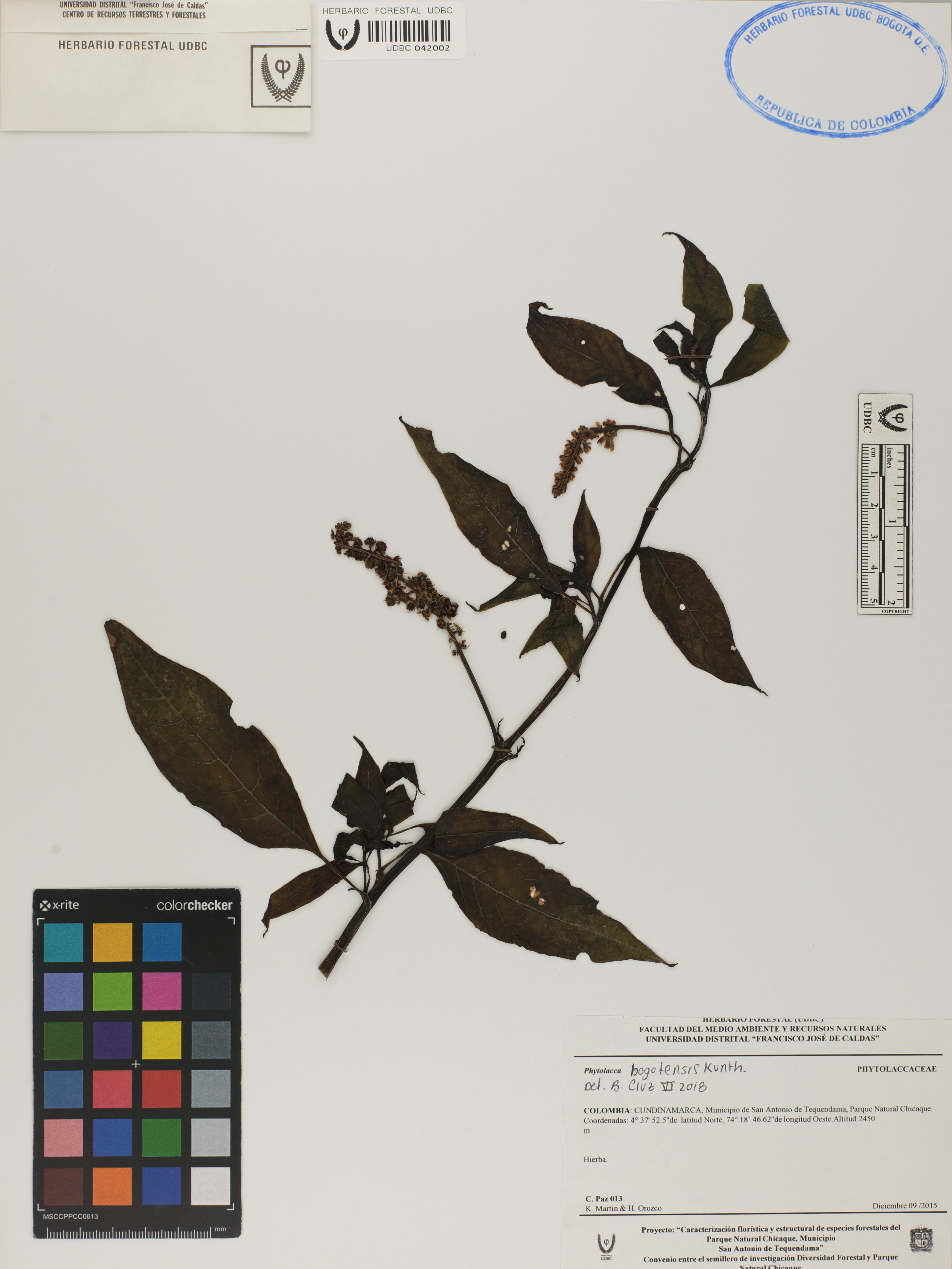 Fotografía del ejemplar Paz, C. 13, determinado como Phytolacca bogotensis en el año 2018