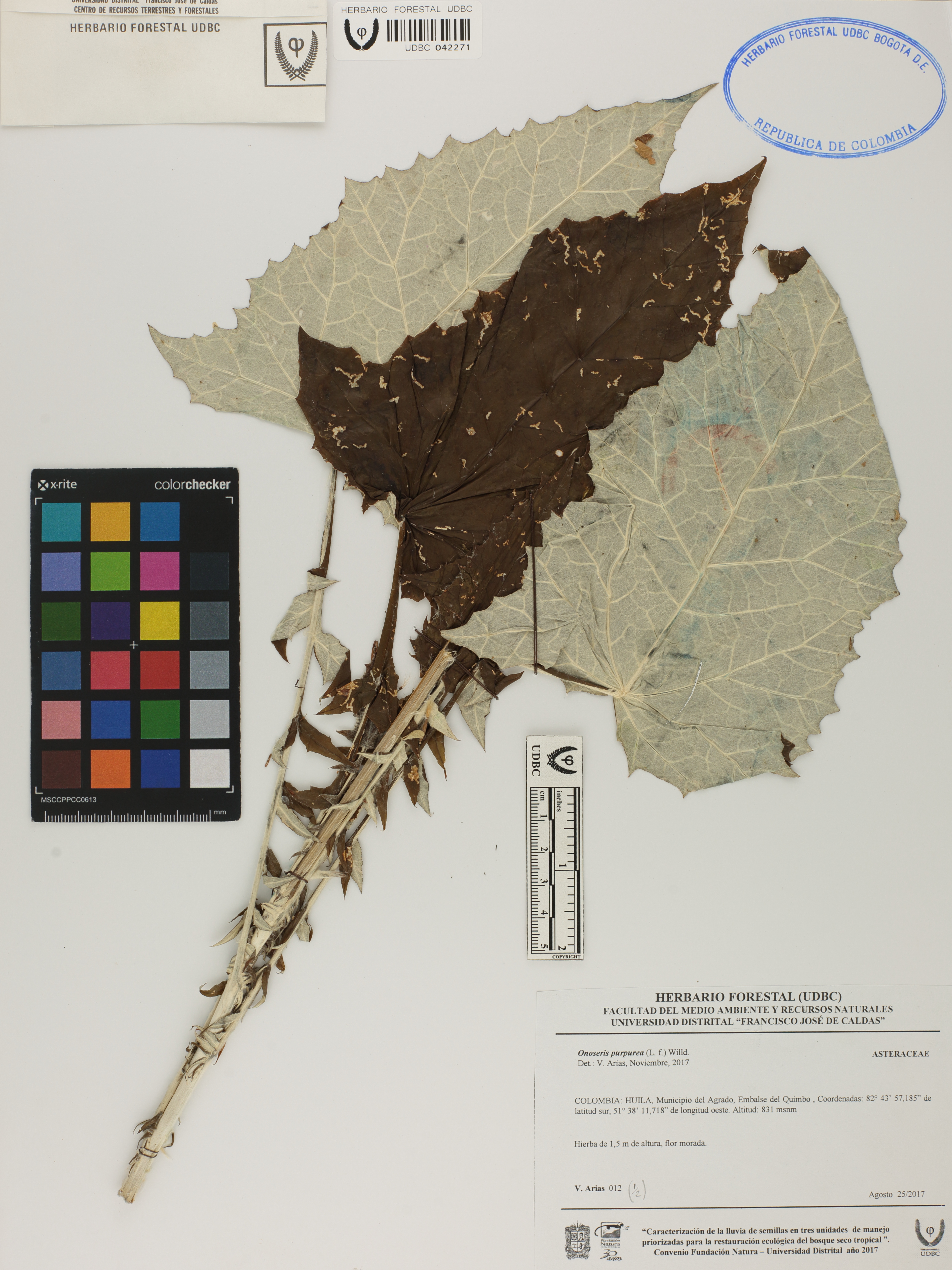 Fotografía del ejemplar Arias, V. 12 (1/2), determinado como Onoseris purpurea en el año 2017
