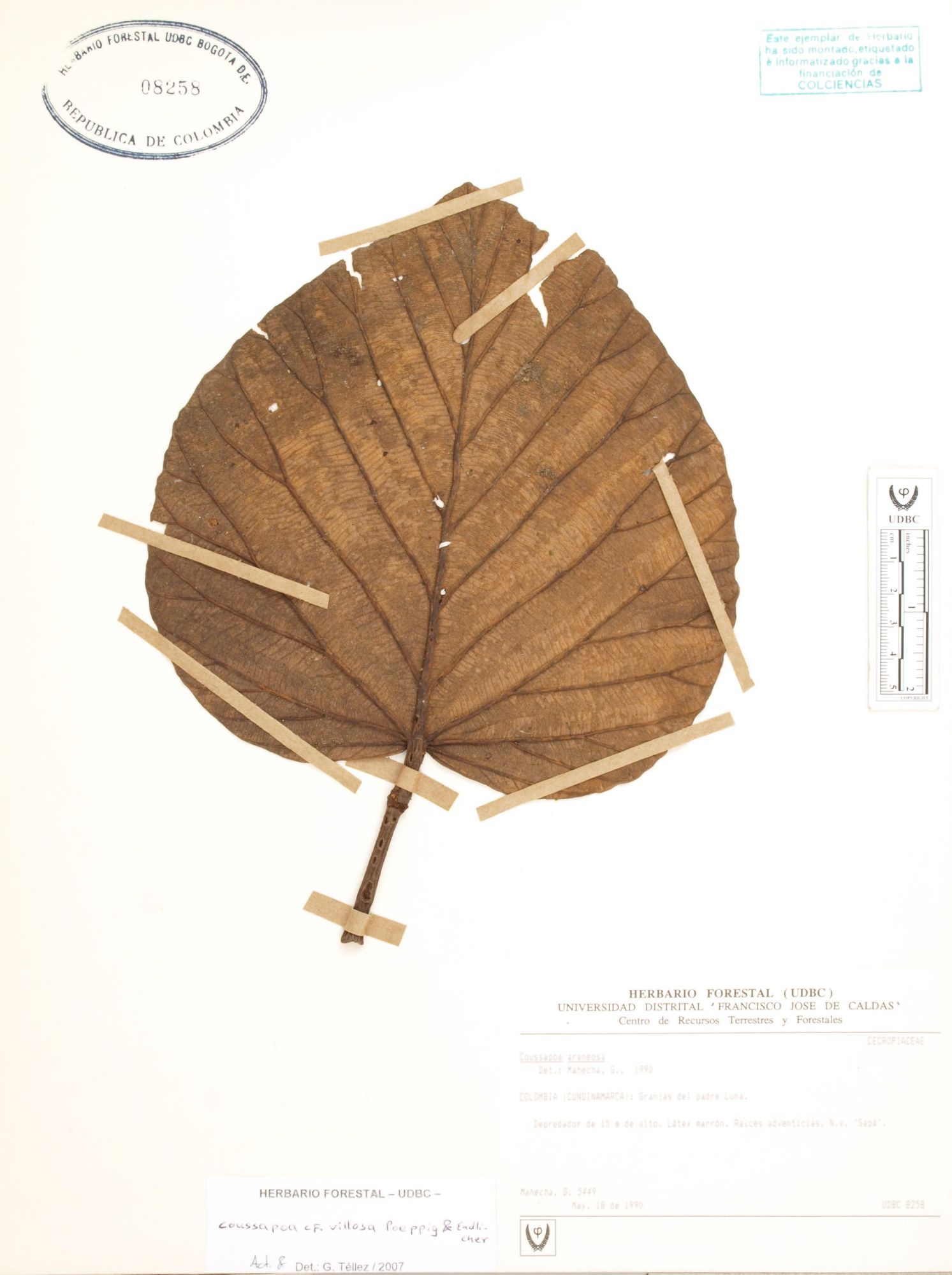 Fotografía del ejemplar Mahecha, G. 5449, determinado como Coussapoa villosa en el año 2007