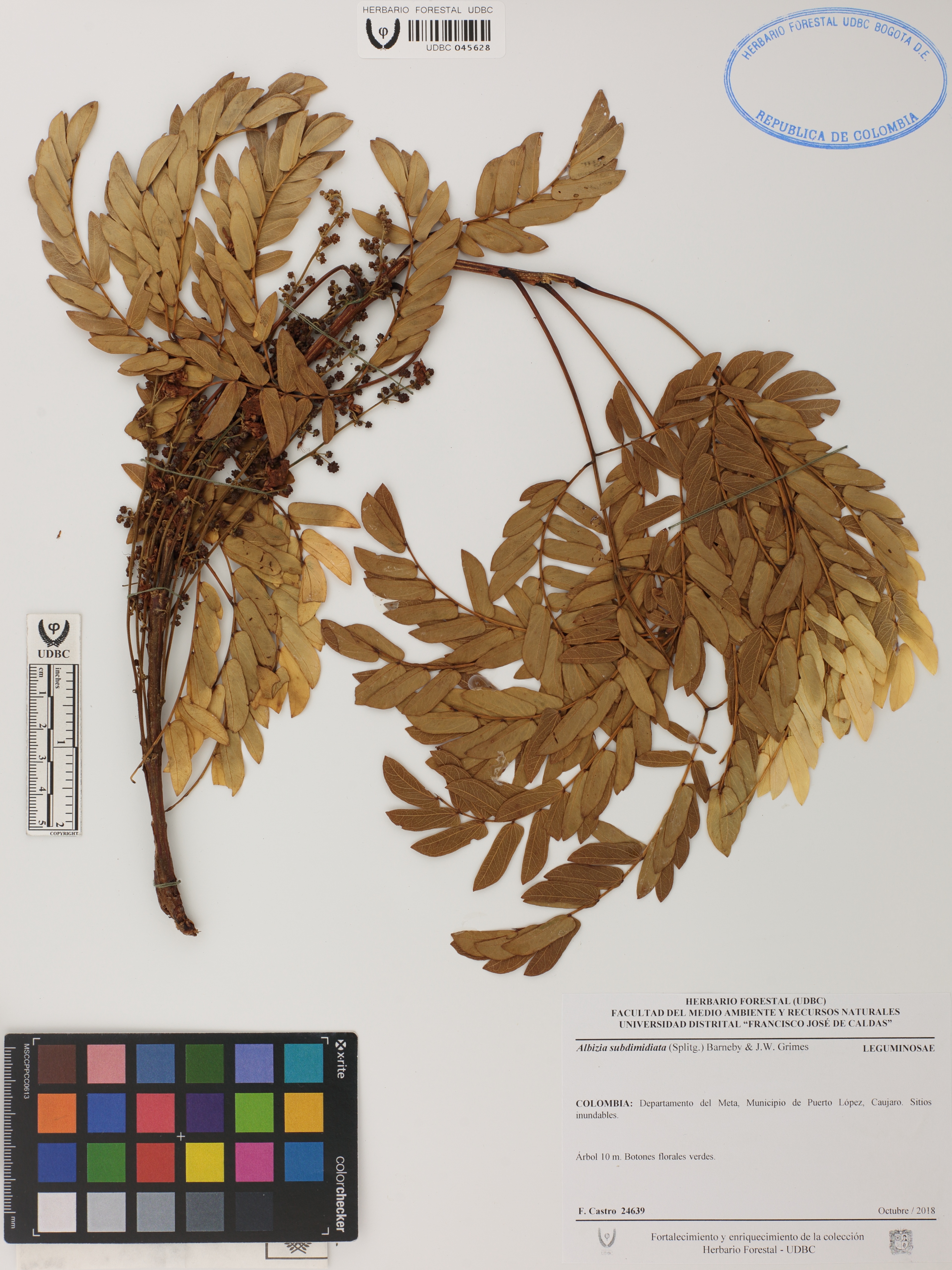 | dc.description | Fotografía del ejemplar Castro, F. 24639, determinado como Albizia subdimidiata en el año 2018 | |