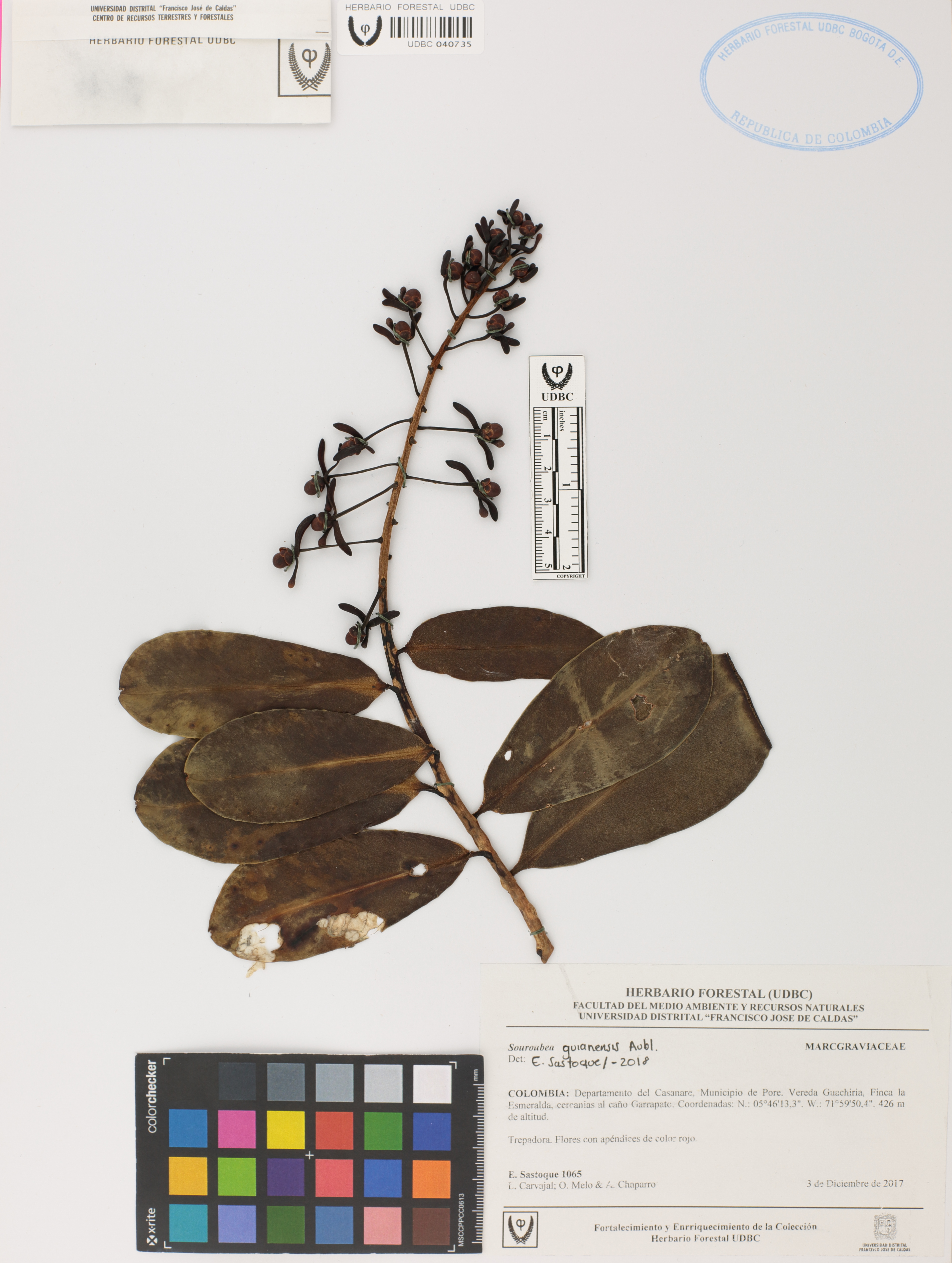 Fotografía del ejemplar Sastoque, E. 1065, determinado como Souroubea guianensis en el año 2018