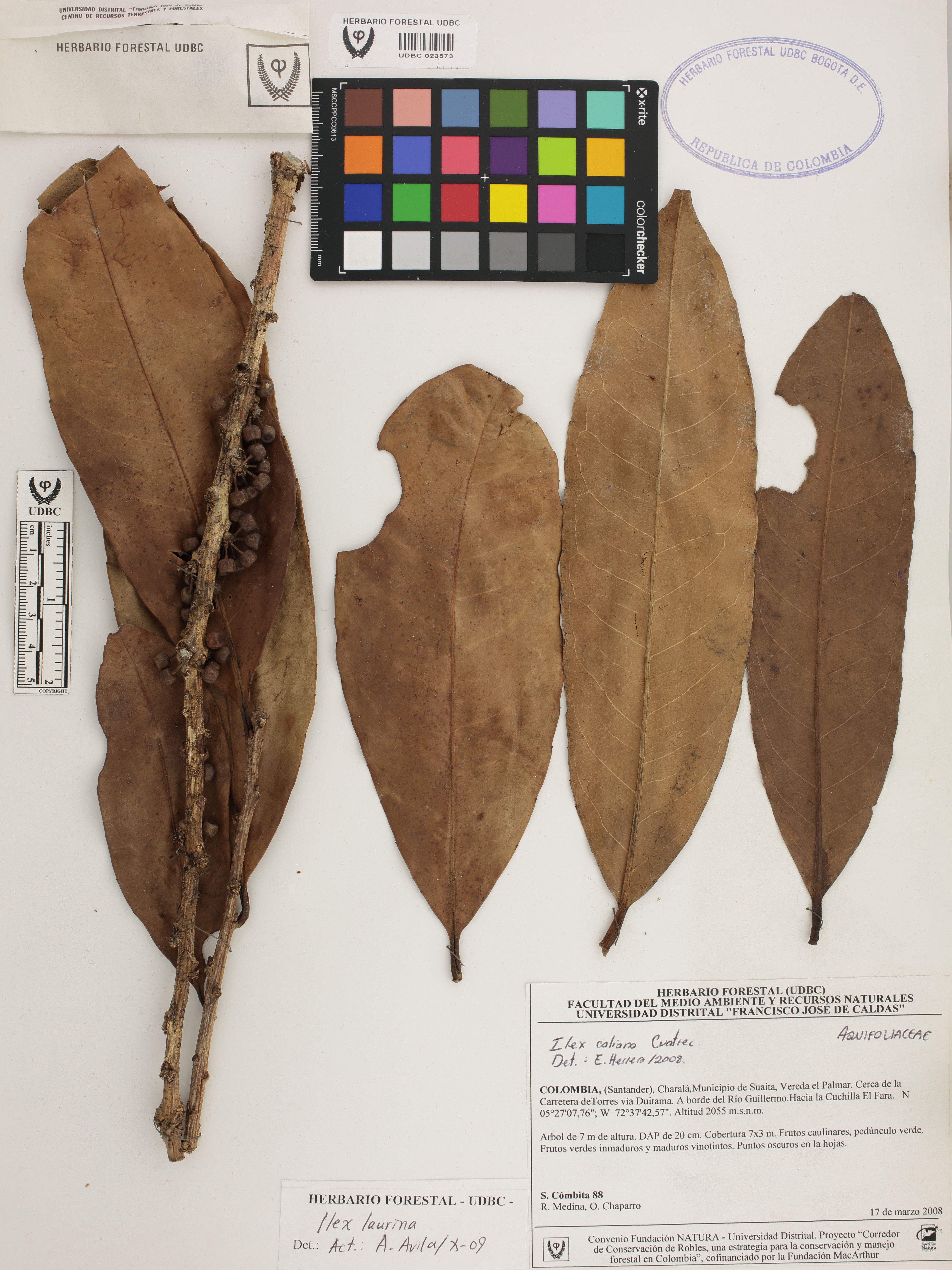 Fotografía del ejemplar Cómbita, S. 88, determinado como Ilex laurina en el año 2009