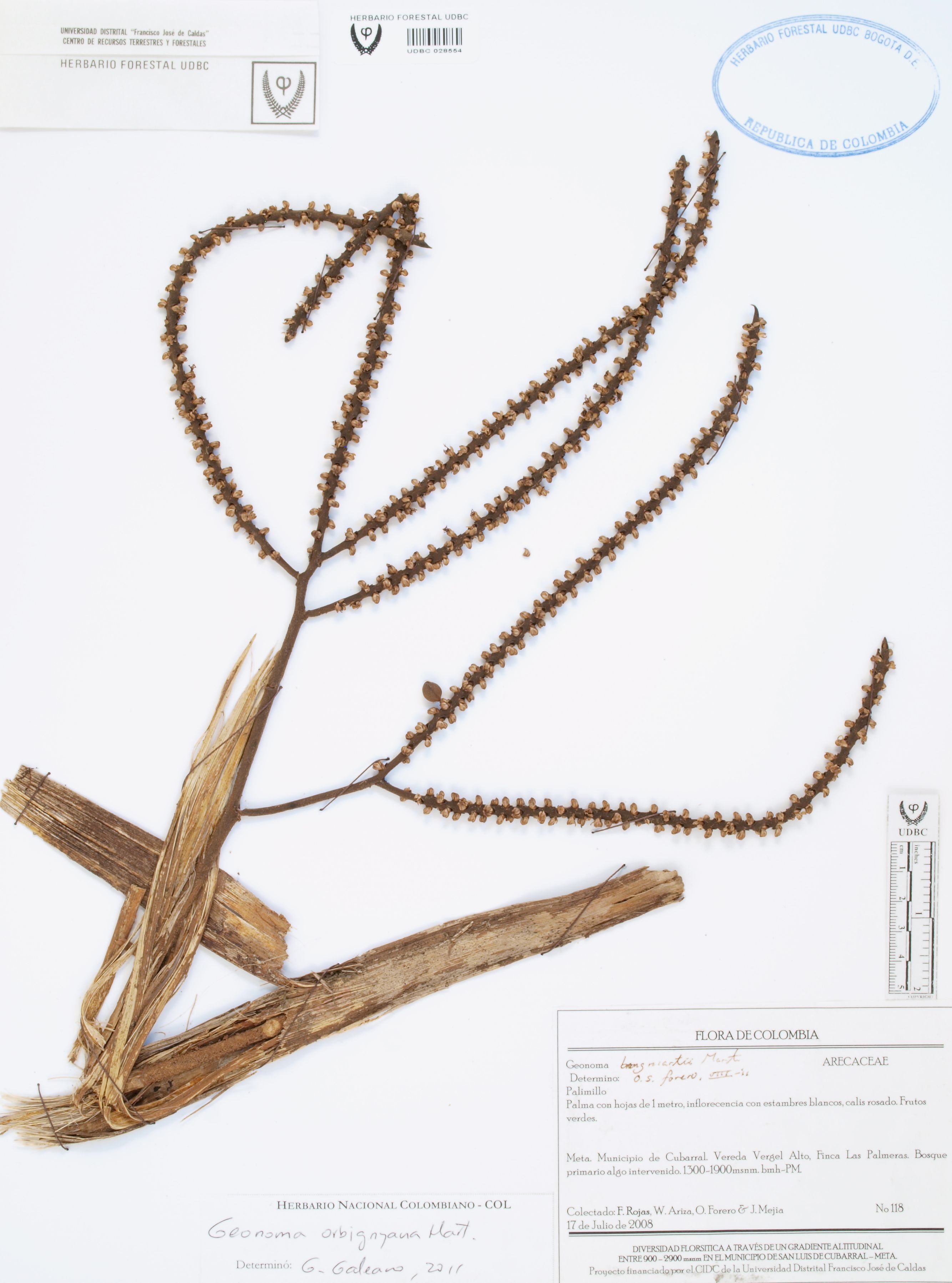Fotografía del ejemplar Rojas, F. 118, determinado como Geonoma orbignyana en el año 2011