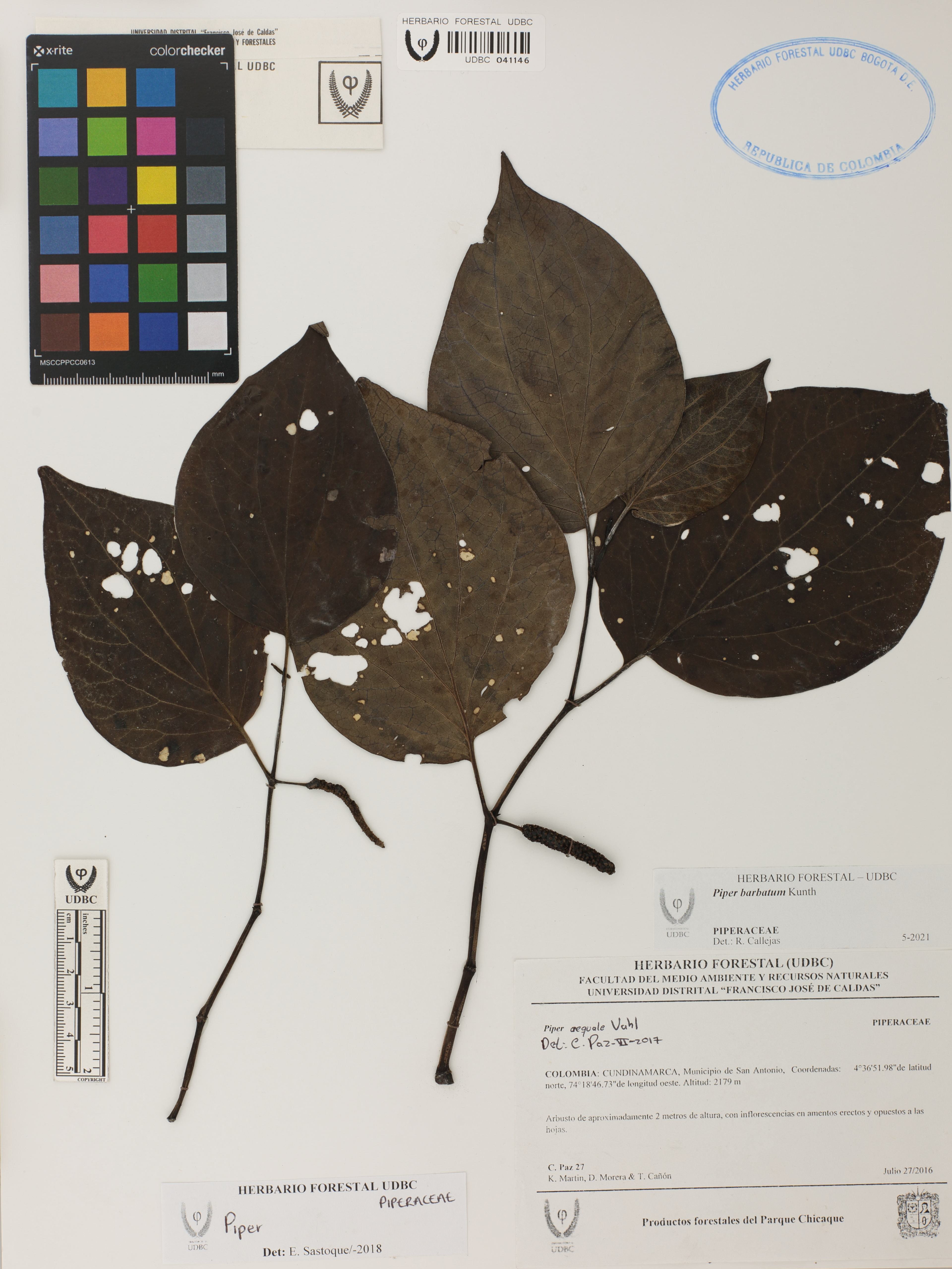 Fotografía del ejemplar Paz, C. 27, determinado como Piper barbatum en el año 2021