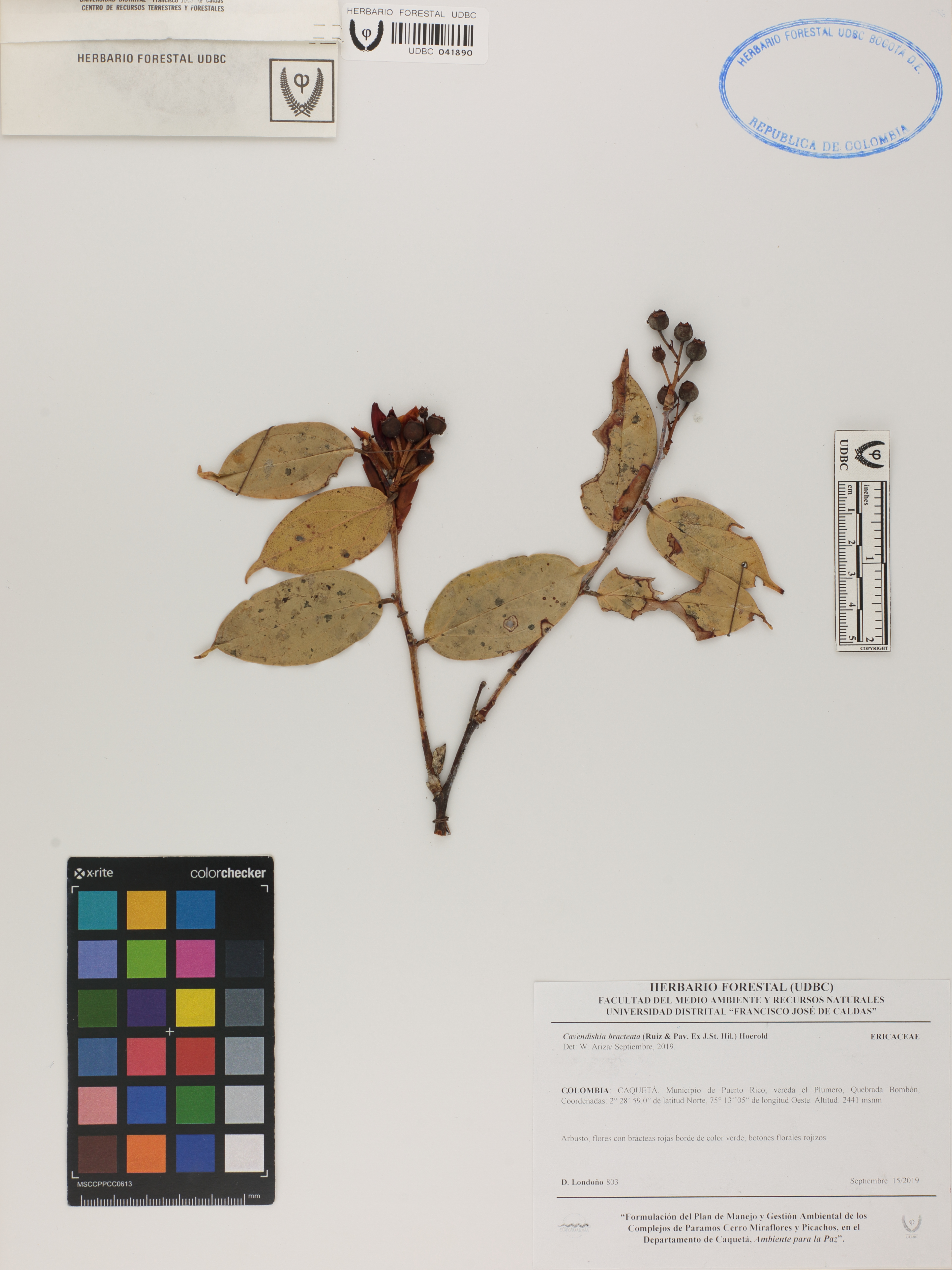 Fotografía del ejemplar Londoño, D. 803, determinado como Cavendishia bracteata en el año 2019