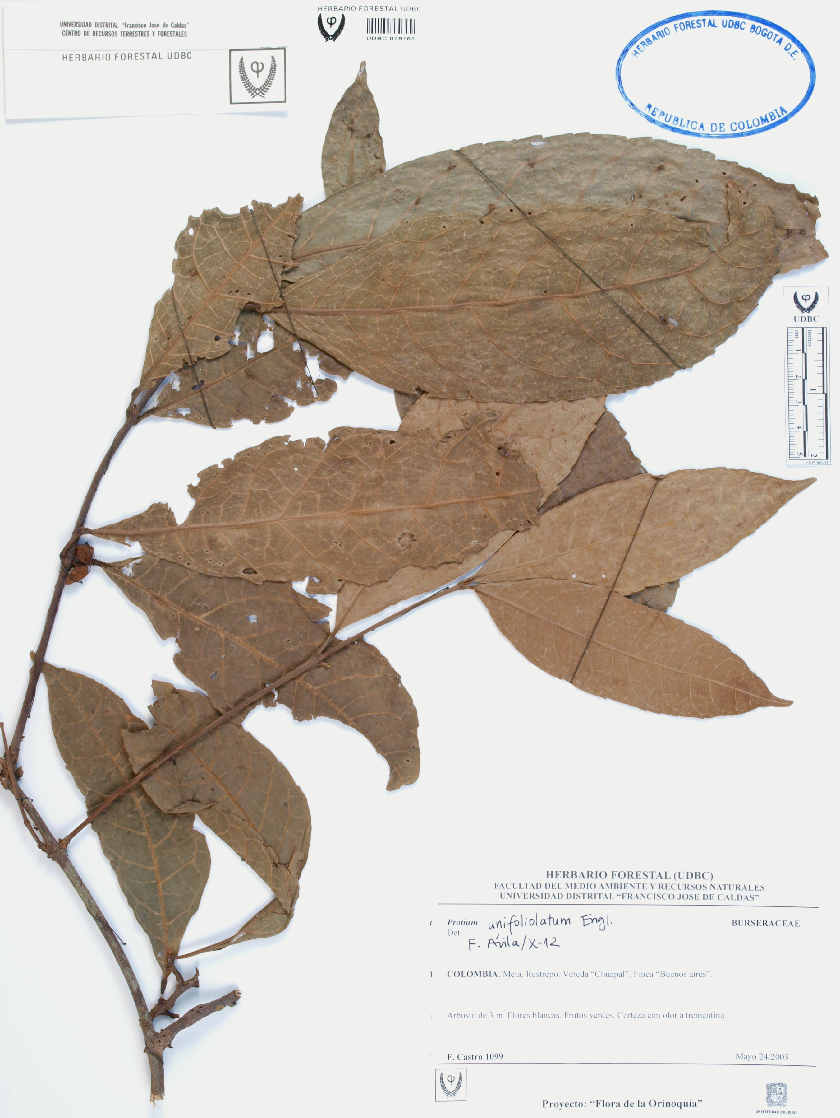 Fotografía del ejemplar Castro, F. 1099, determinado como Protium unifoliolatum en el año 2012