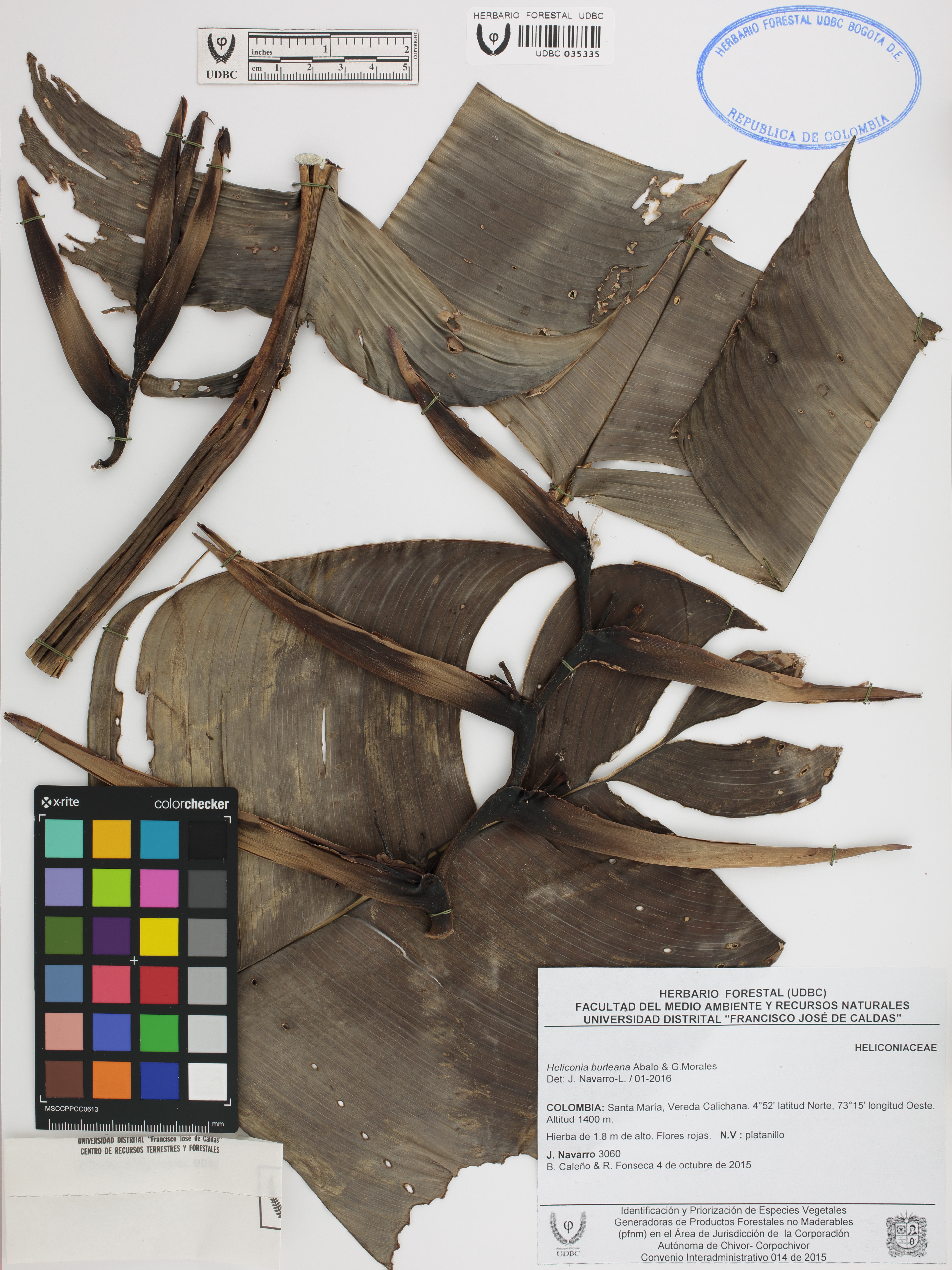 Fotografía del ejemplar Navarro, J. 3060, determinado como Heliconia burleana en el año 2016