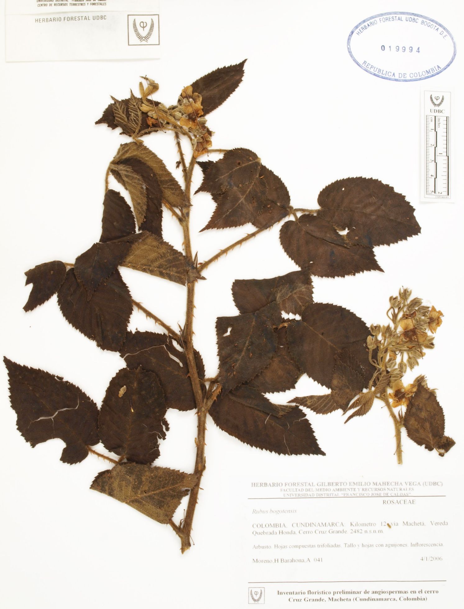 Fotografía del ejemplar Moreno, H. 41, determinado como Rubus bogotensis