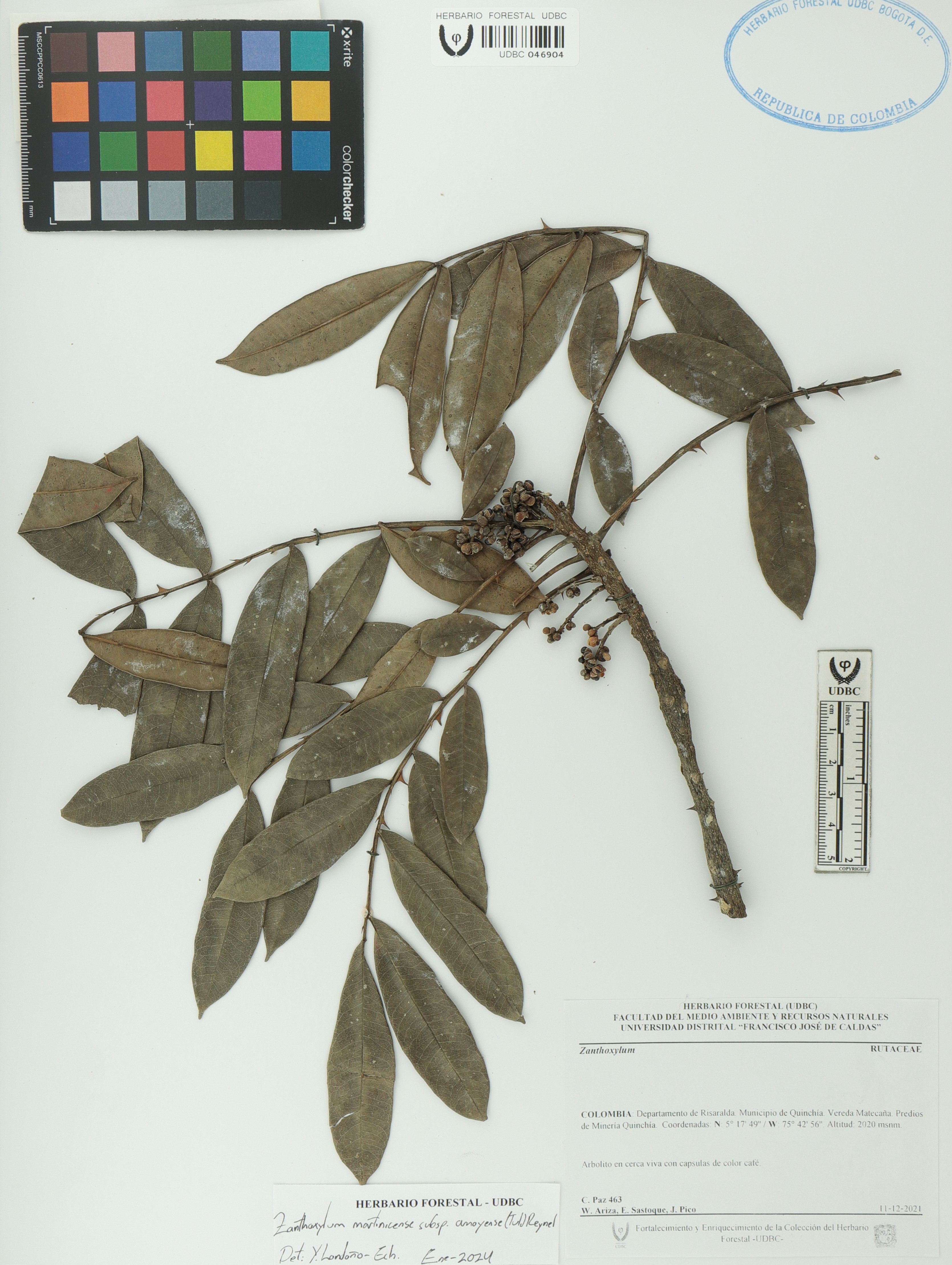 Fotografía del ejemplar Paz, C. 463, determinado como Zanthoxylum martinicense subsp. amoyense en el año 2024