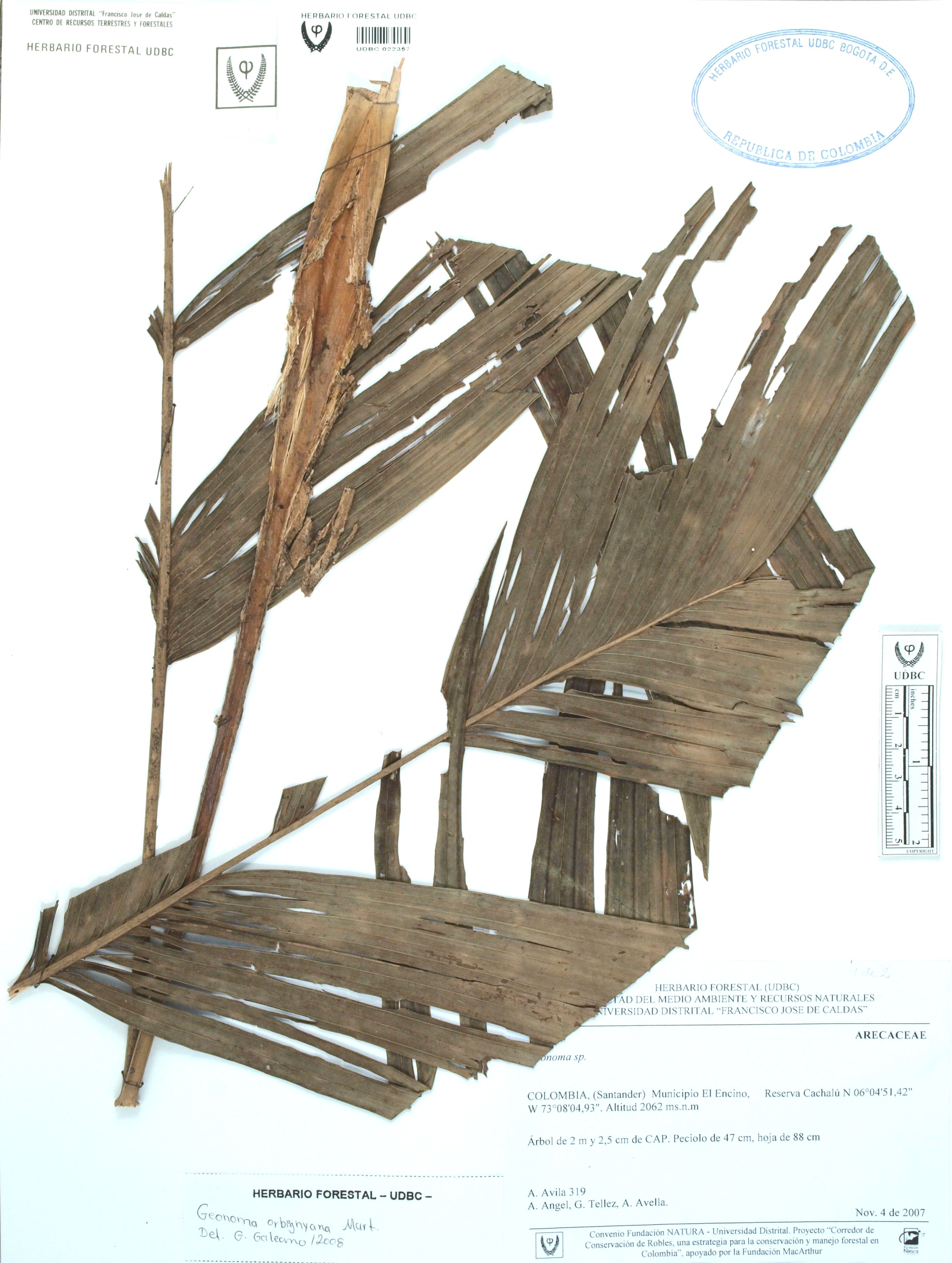 Fotografía del ejemplar Ávila, A. 319, determinado como Geonoma orbignyana en el año 2008
