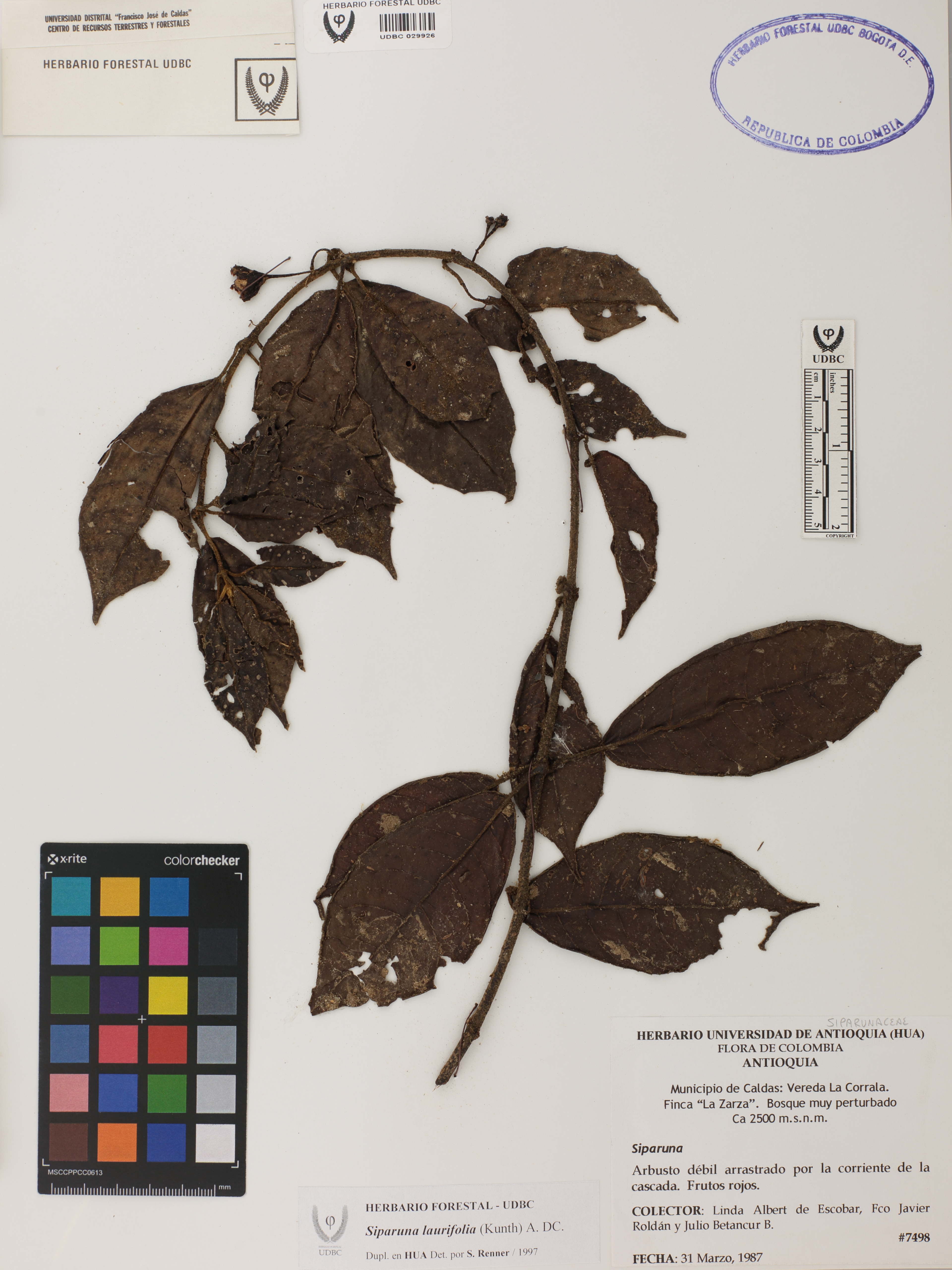Fotografía del ejemplar Albert de E., L. 7498, determinado como Siparuna laurifolia en el año 1997