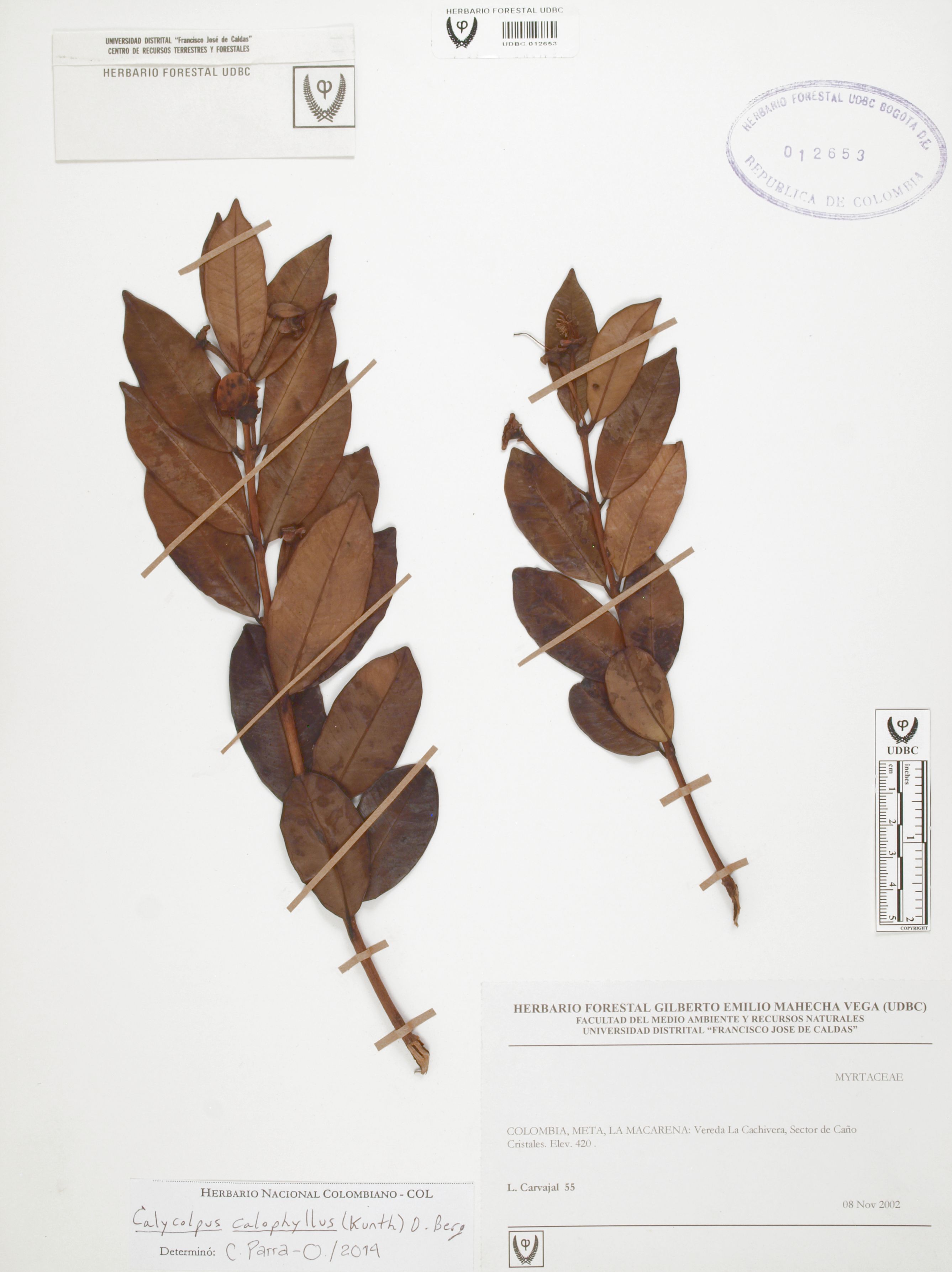 Fotografía del ejemplar Carvajal, L. 55, determinado como Calycolpus calophyllus en el año 2014