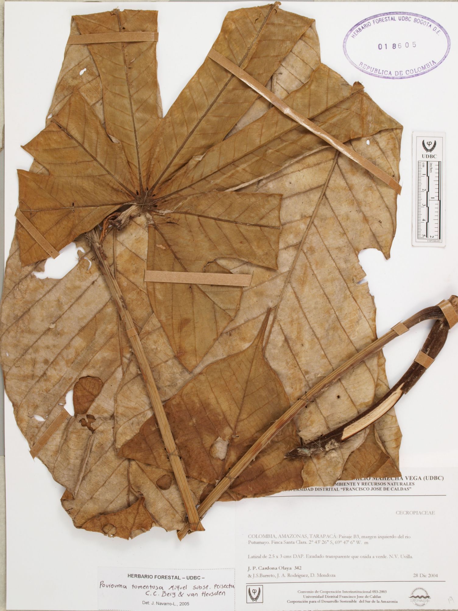 Fotografía del ejemplar Cardona, J. 342, determinado como Pourouma tomentosa en el año 2005