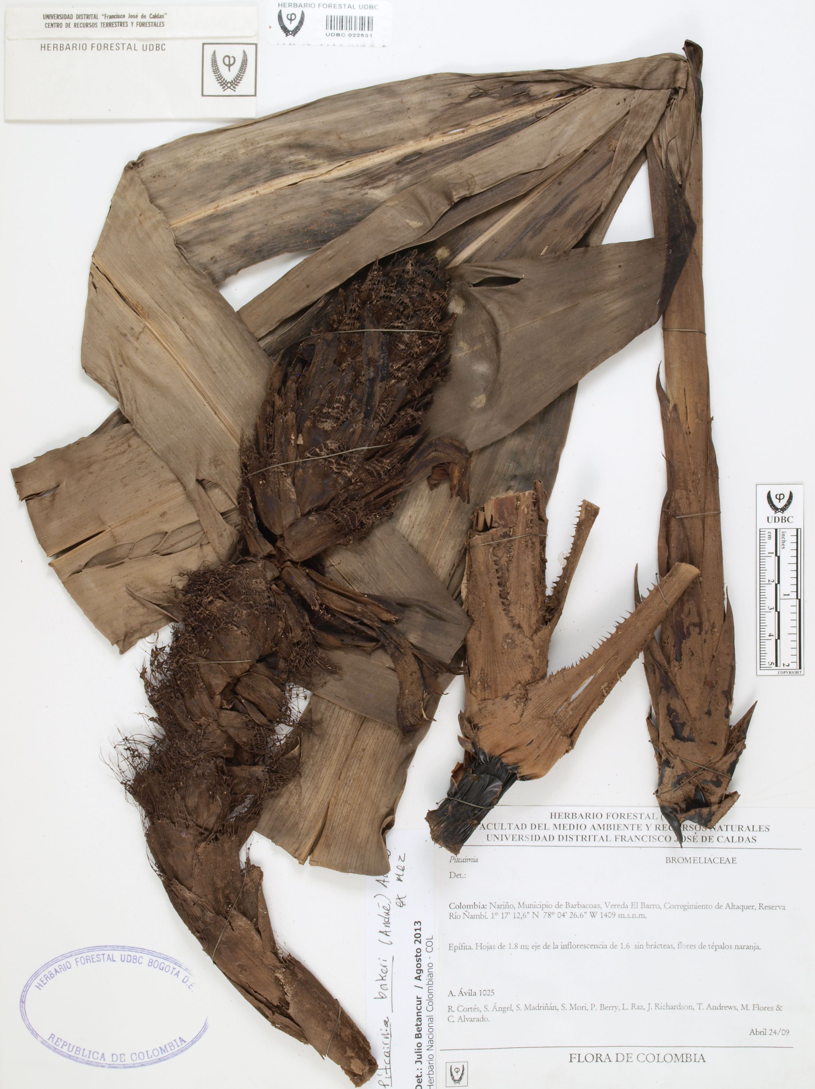 Fotografía del ejemplar Ávila, F. 1025, determinado como Pitcairnia bakeri en el año 2013