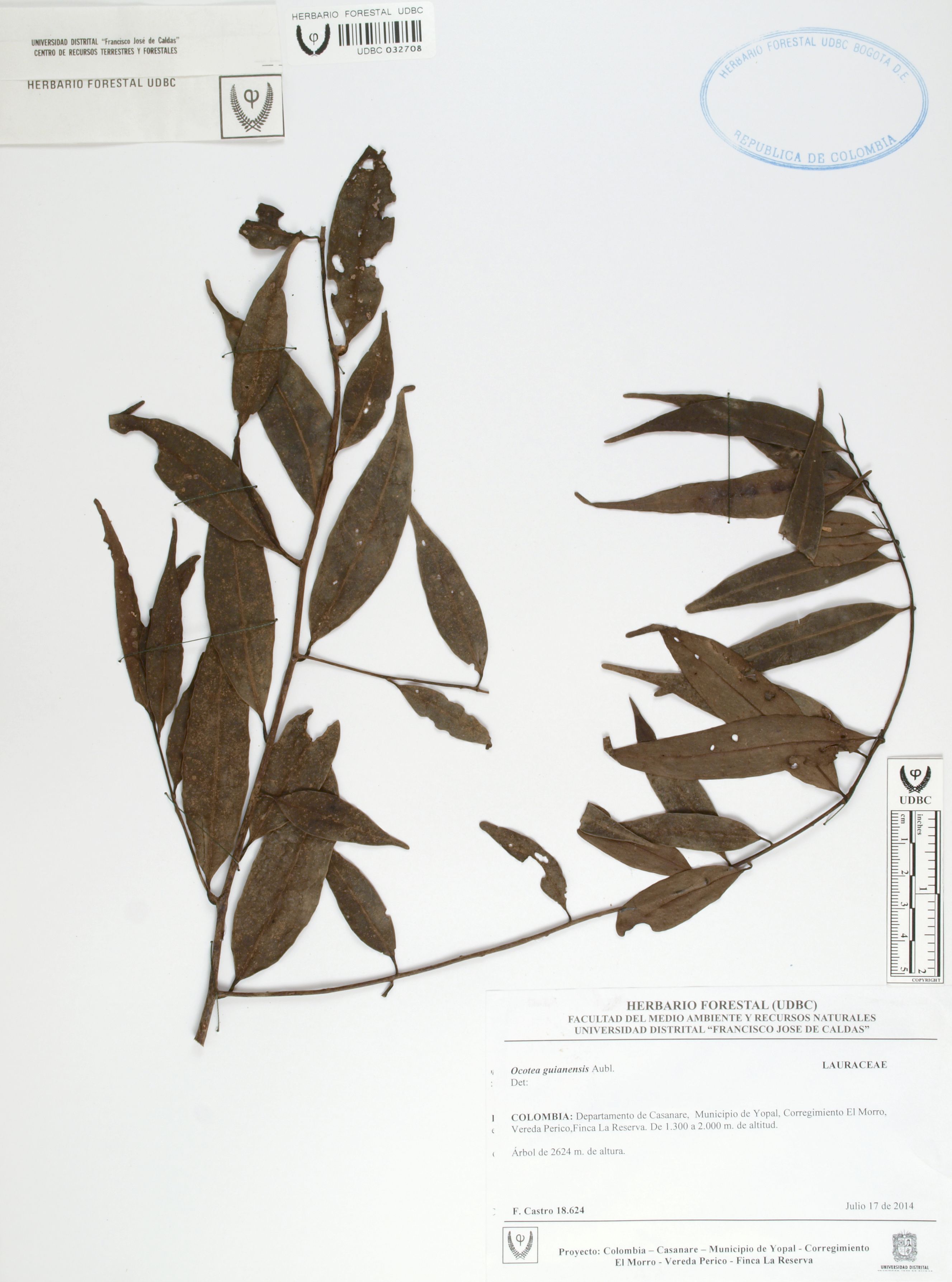 Fotografía del ejemplar Castro, F. 18624, determinado como Ocotea guianensis