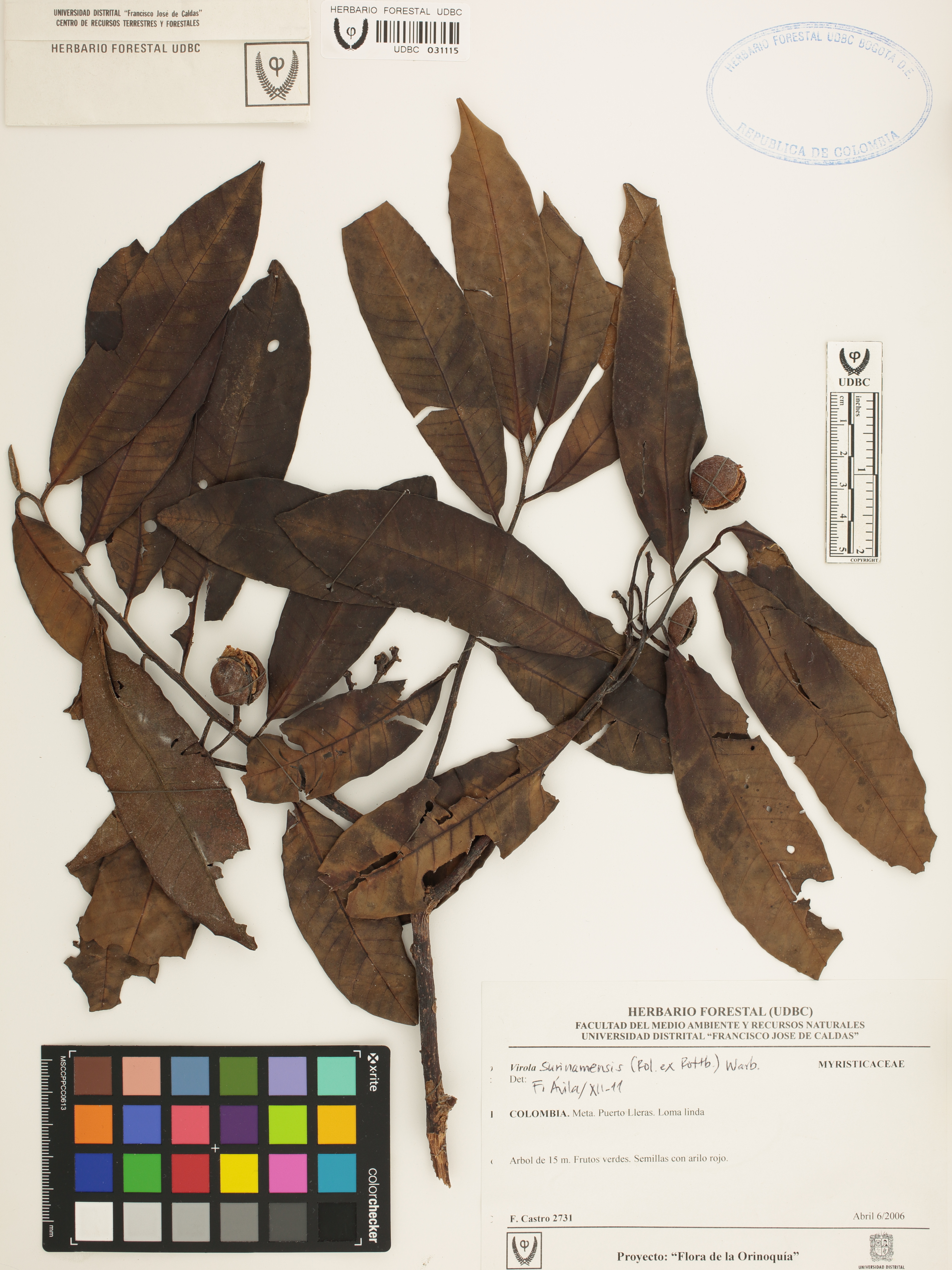 Fotografía del ejemplar Castro, F. 2731, determinado como Virola surinamensis en el año 2011