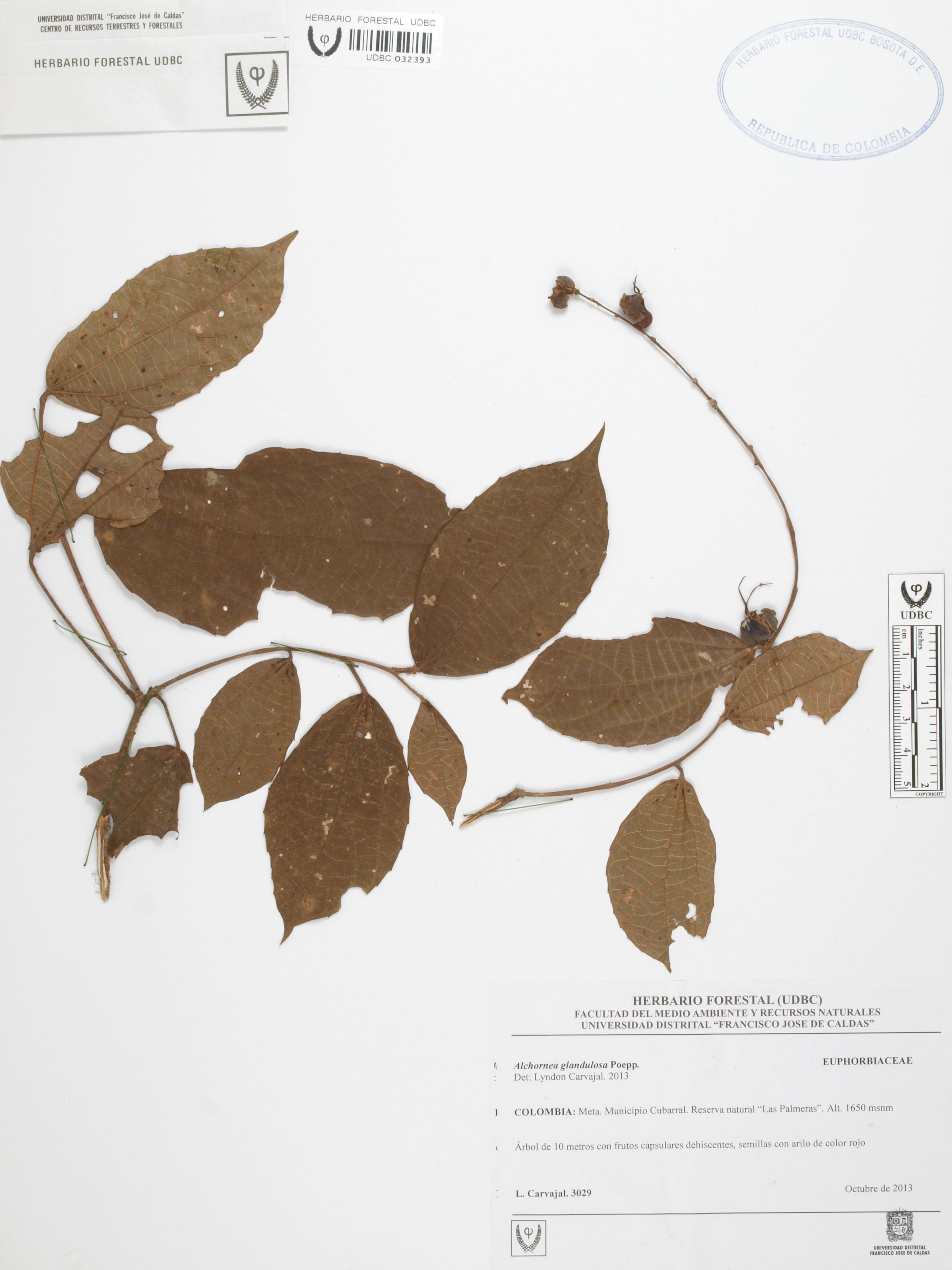 Fotografía del ejemplar Carvajal, L. 3029, determinado como Alchornea glandulosa en el año 2013