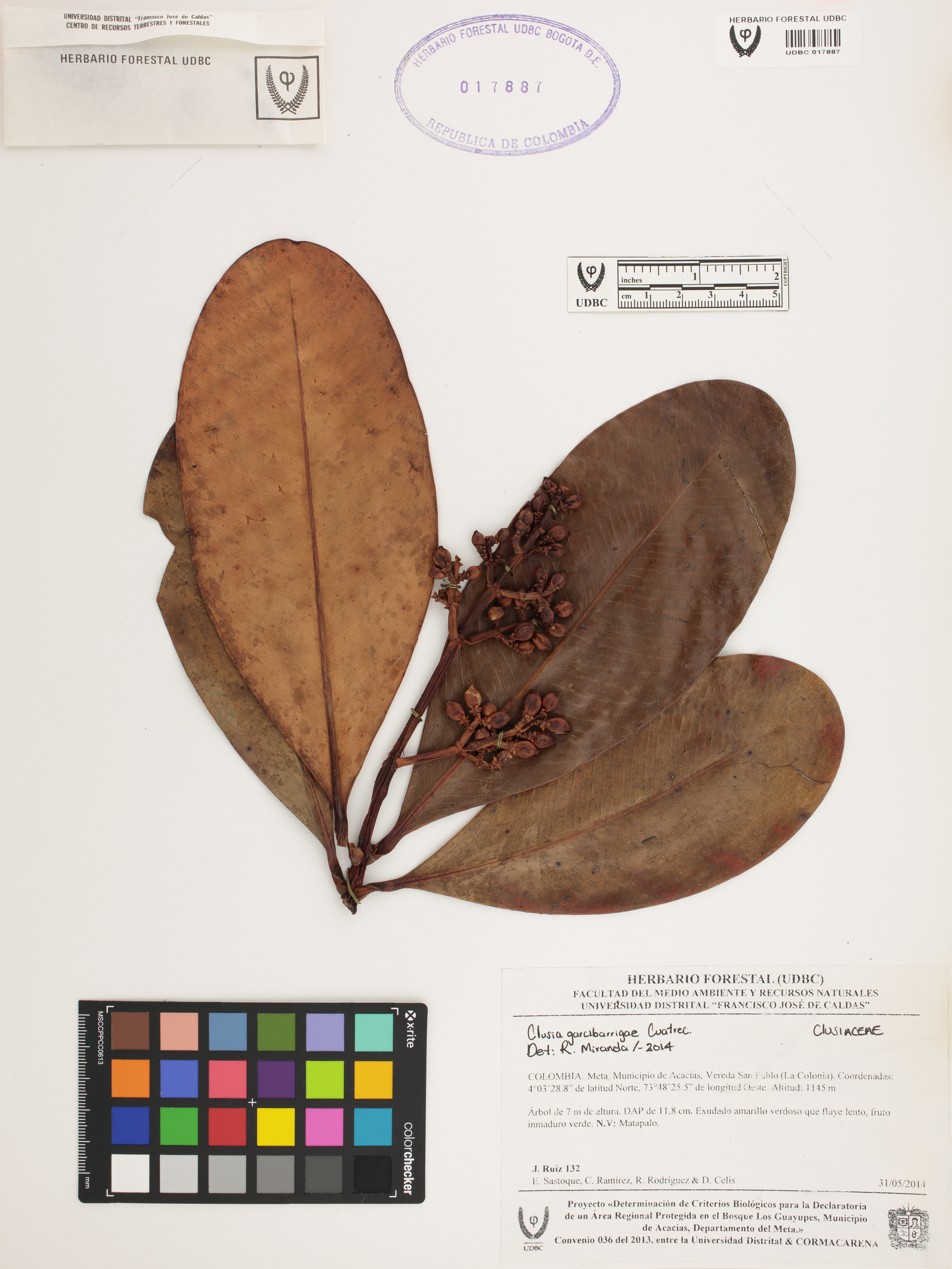 Fotografía del ejemplar Ruiz, J. 132, determinado como Clusia garcibarrigae en el año 2014