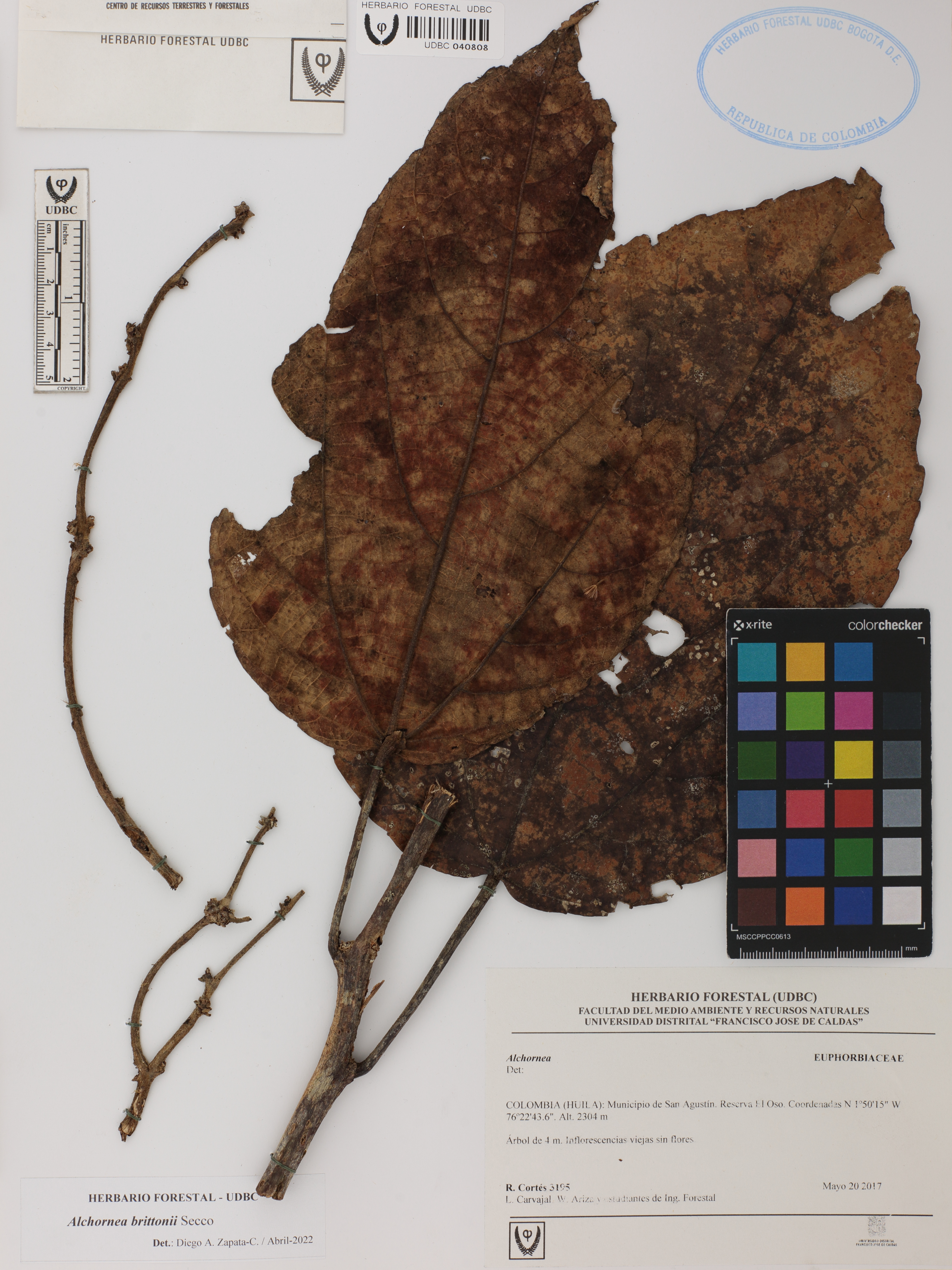 | dc.description | Fotografía del ejemplar Cortés, R. 3195, determinado como Alchornea brittonii en el año 2022 | |