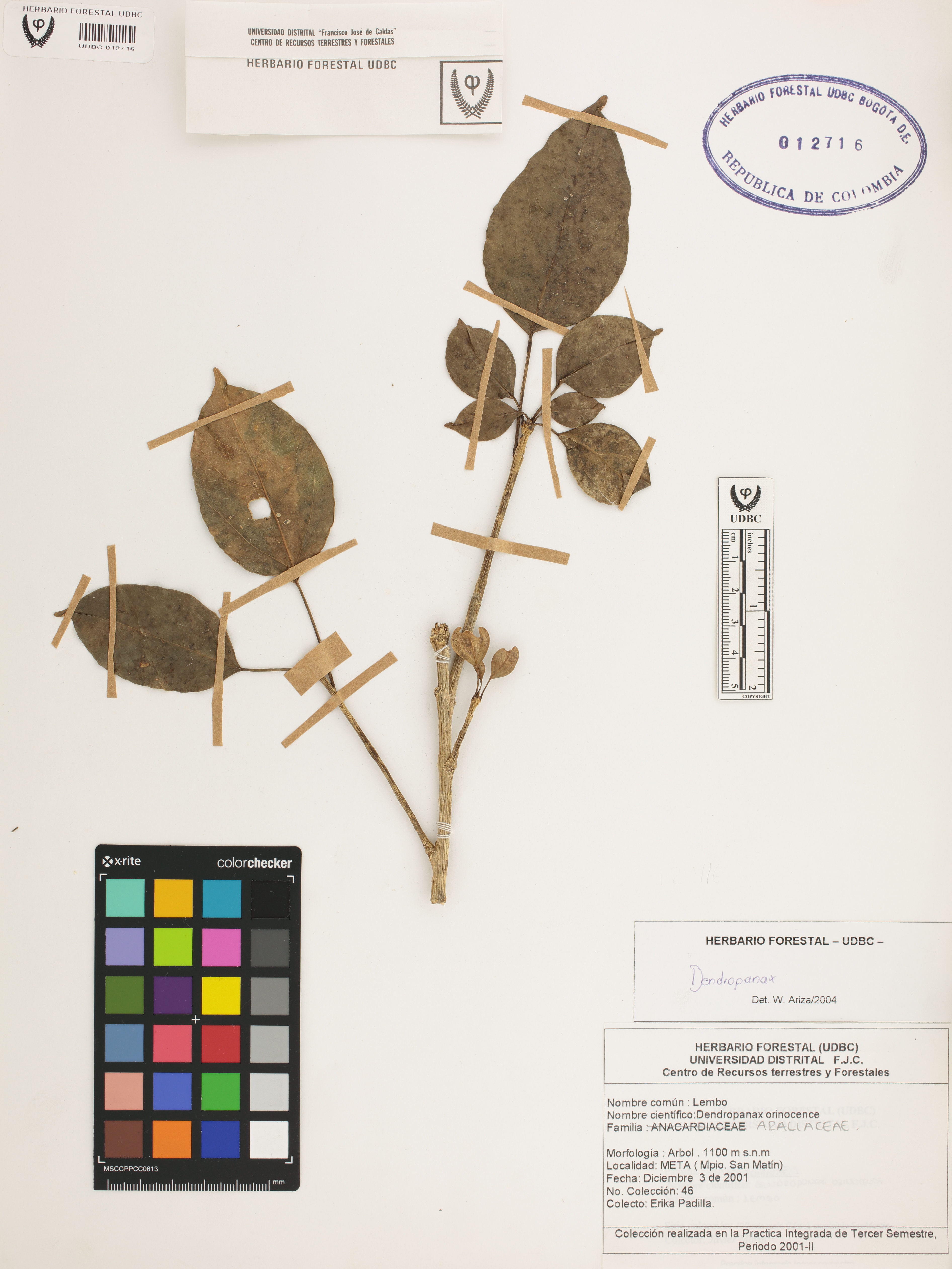 Fotografía del ejemplar Padilla, E. 46, determinado como Dendropanax sp. en el año 2004