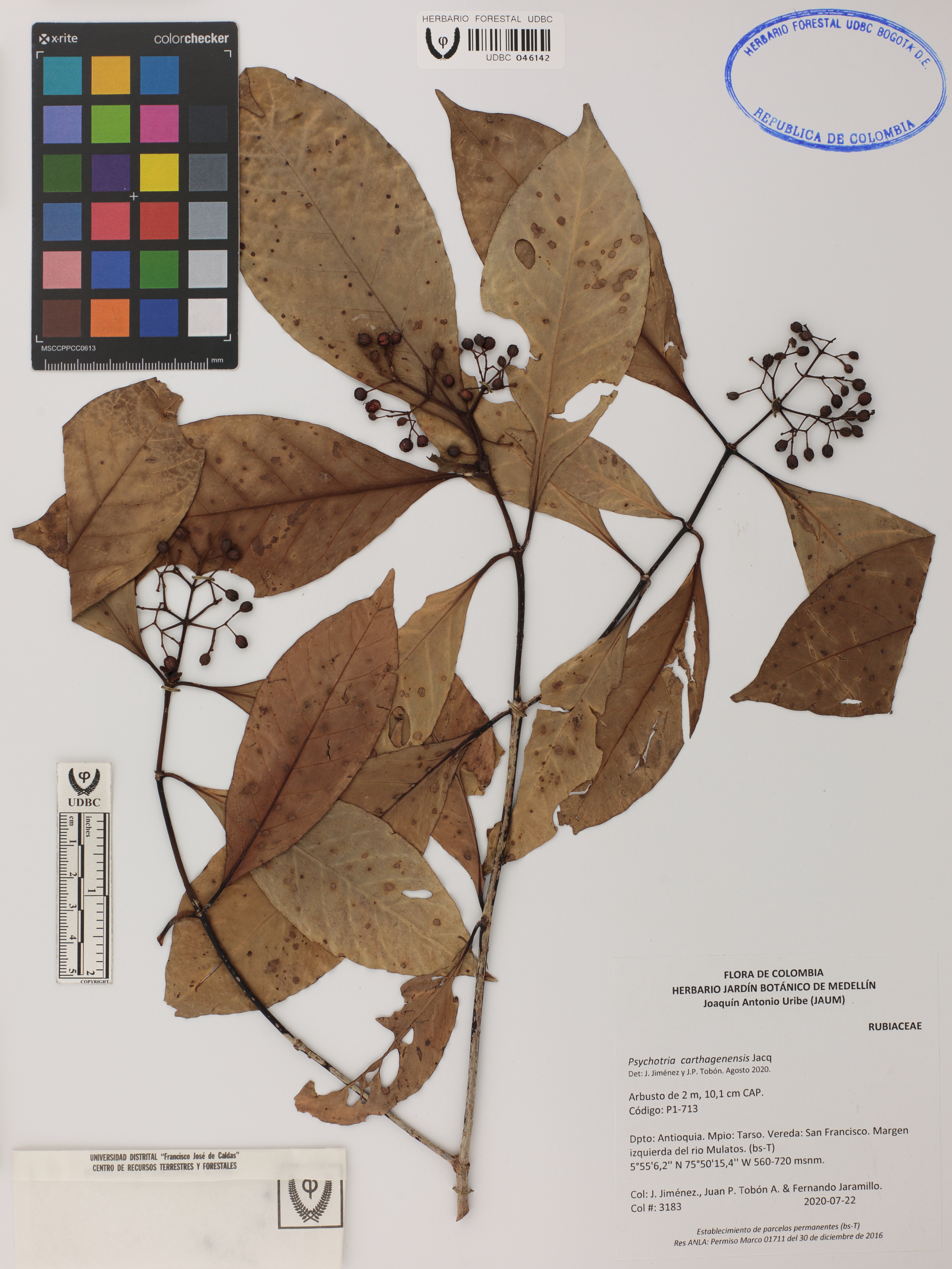 Fotografía del ejemplar Jiménez, J. 3183, determinado como Psychotria carthagenensis en el año 2020