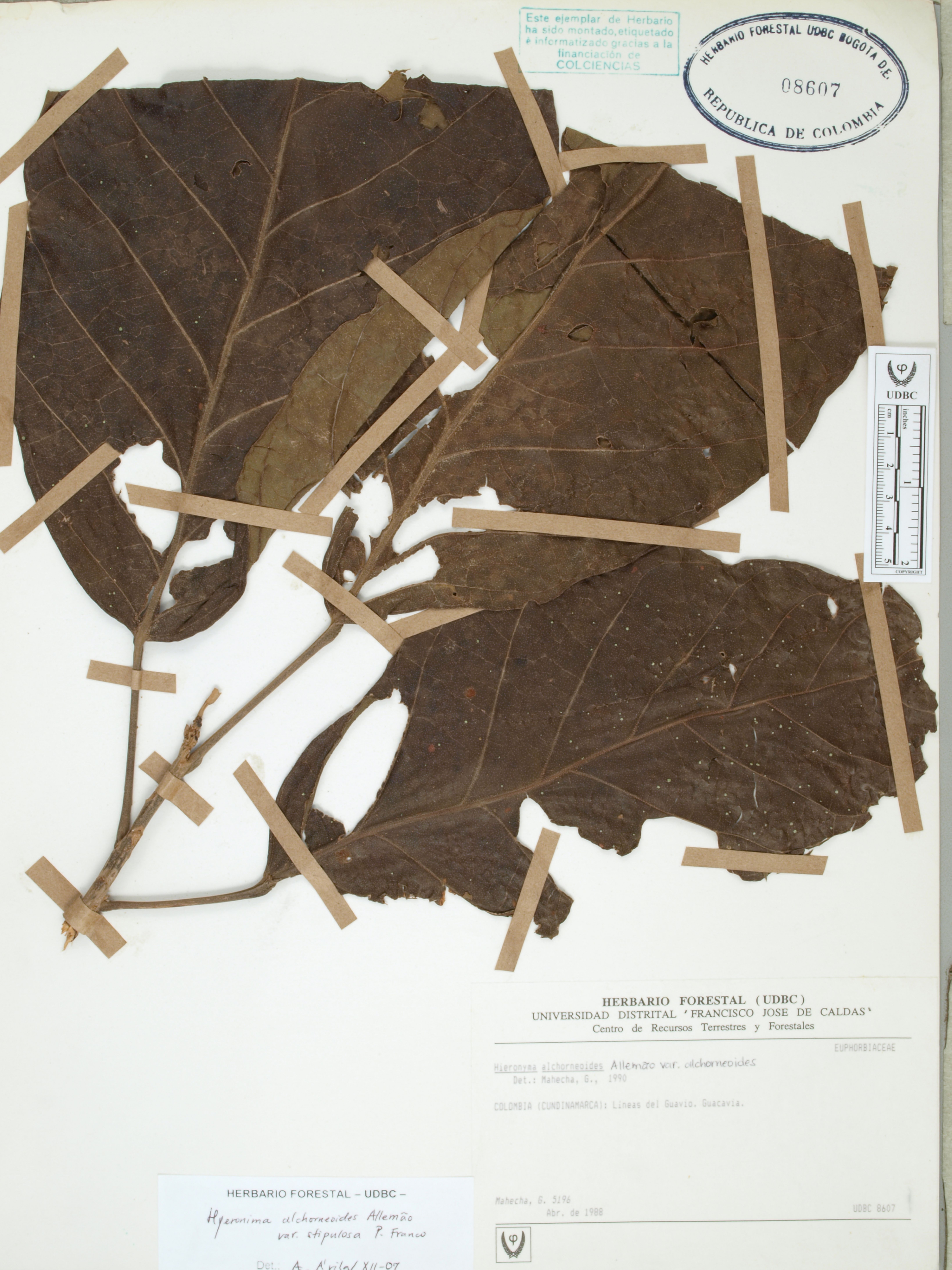 Fotografía del ejemplar Mahecha, G. 5196, determinado como Hieronyma alchorneoides var. stipulosa en el año 2007