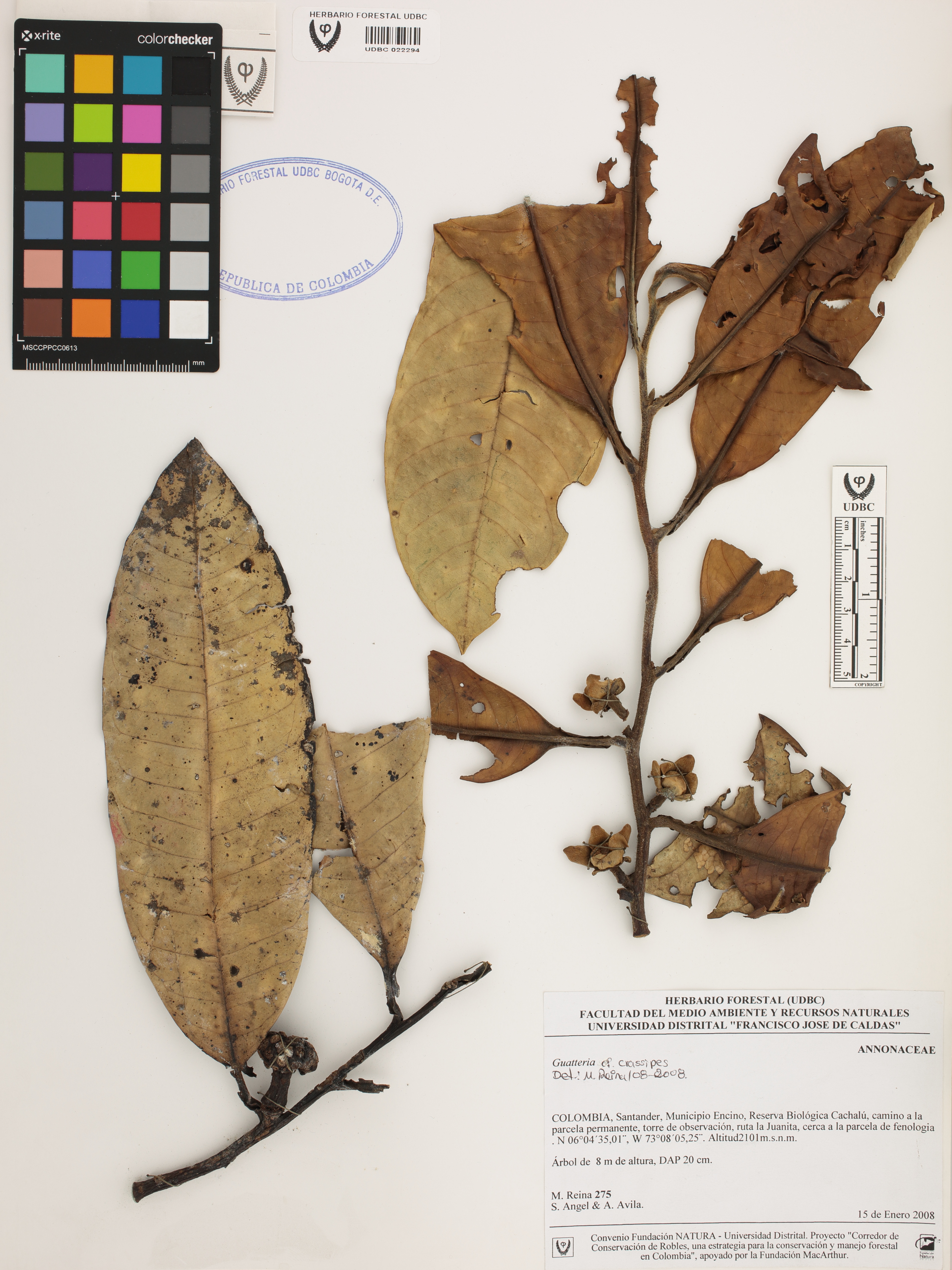 Fotografía del ejemplar Reina, M. 275, determinado como Guatteria crassipes en el año 2008