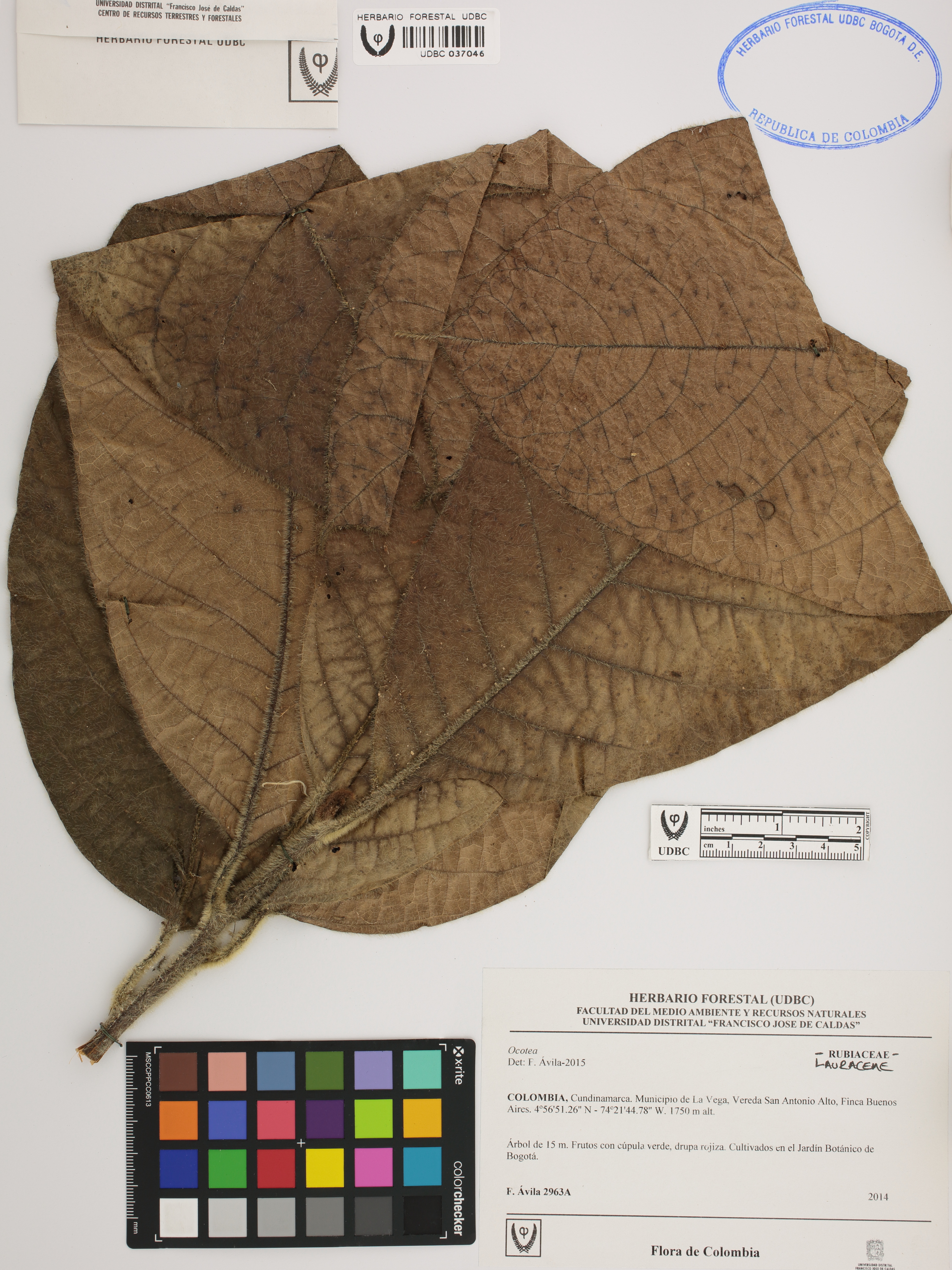 Fotografía del ejemplar Ávila, F. 2963 A, determinado como Ocotea sp. en el año 2015