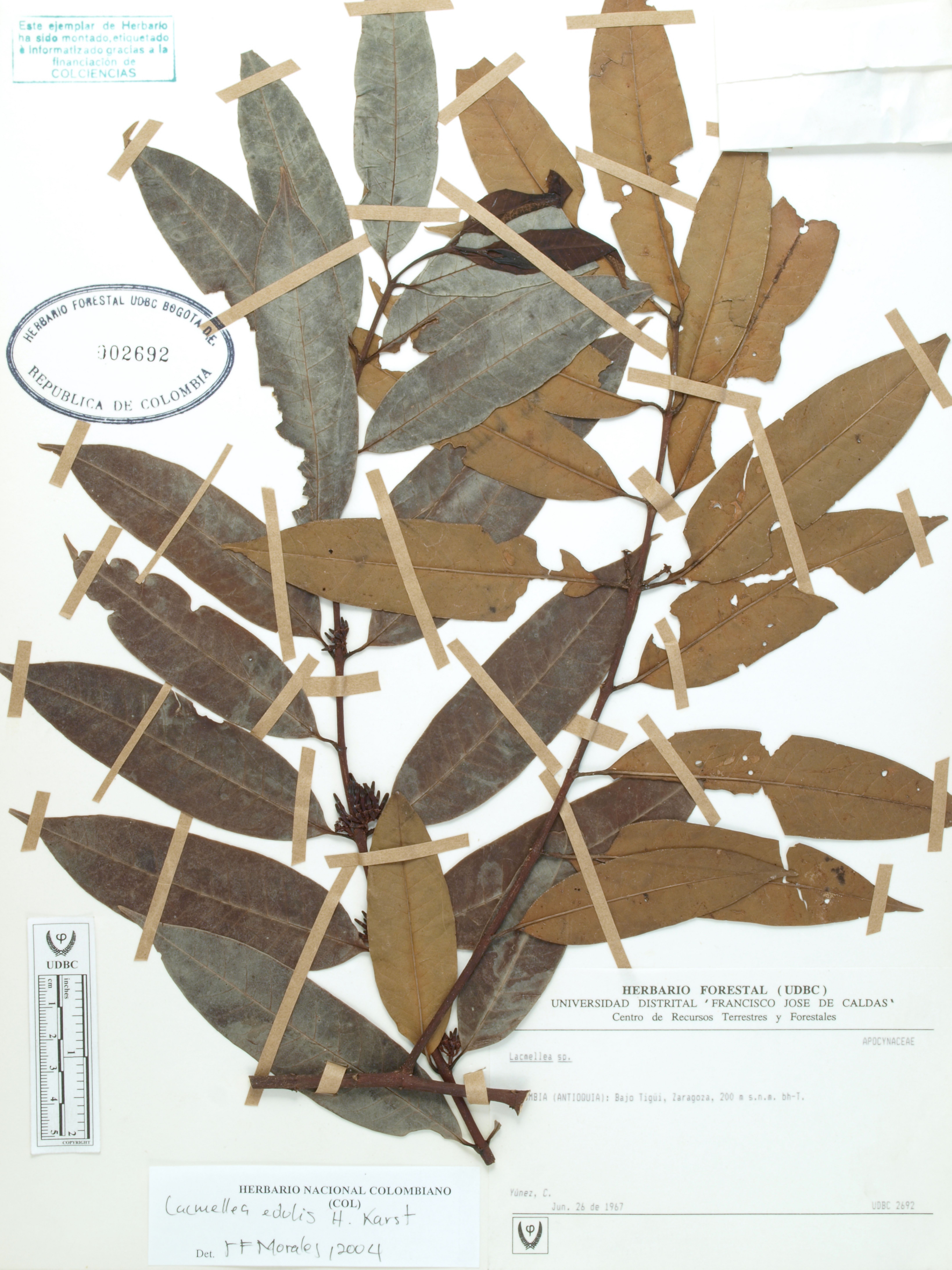 Fotografía del ejemplar Yúñez, C., determinado como Lacmellea edulis en el año 2004