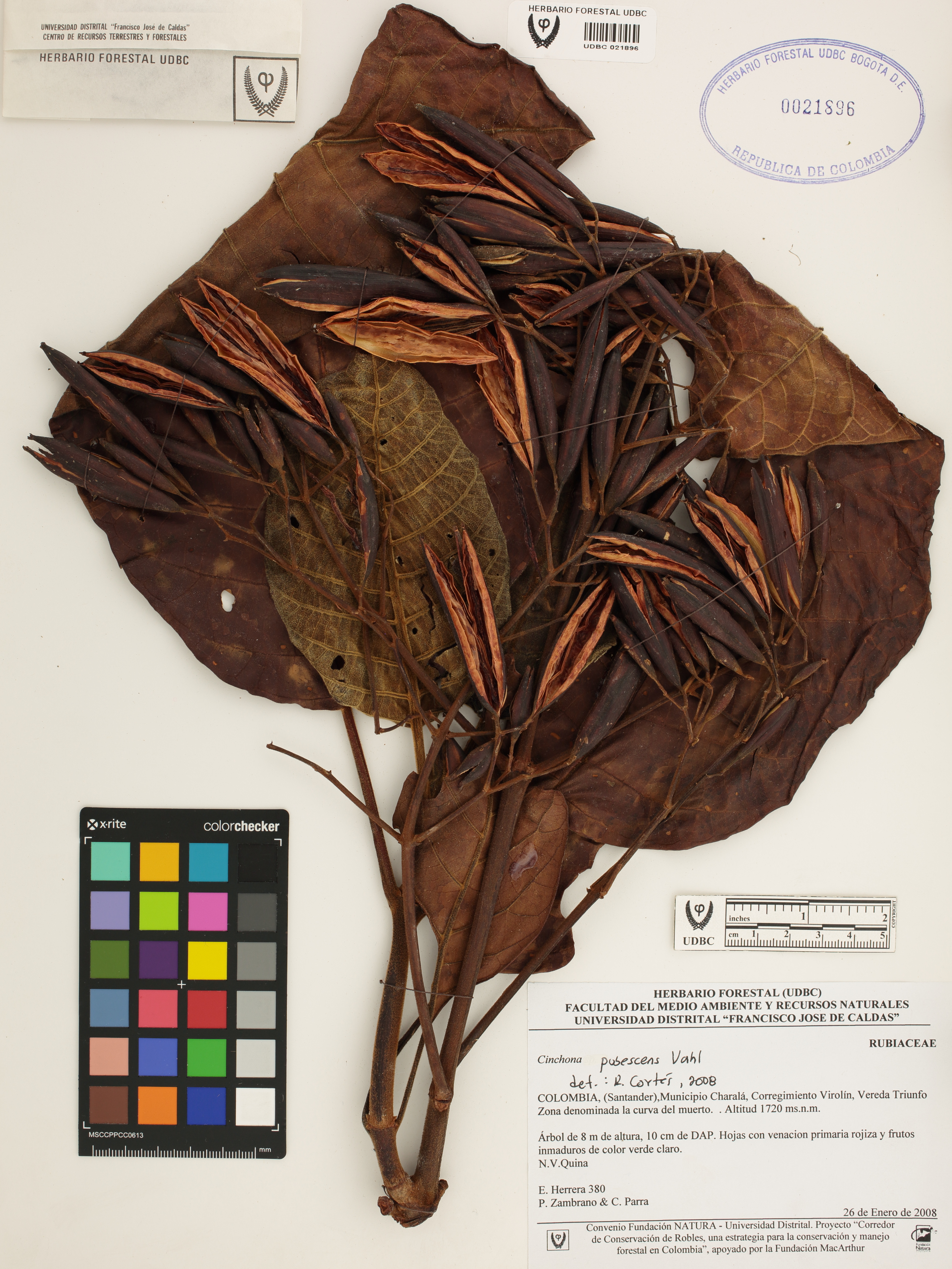 Fotografía del ejemplar Herrera, E. 380, determinado como Cinchona pubescens en el año 2008