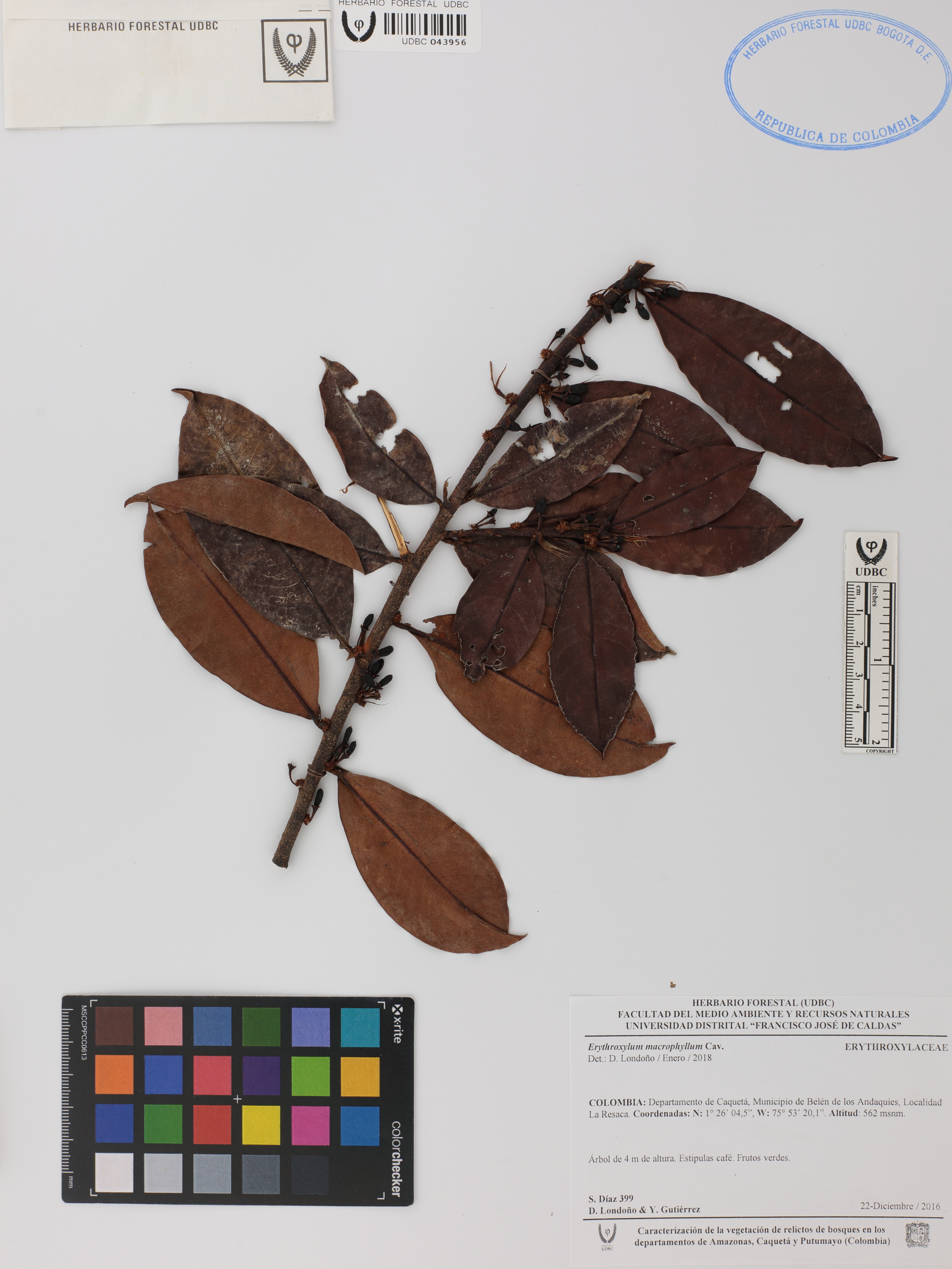 Fotografía del ejemplar Díaz, S. 399, determinado como Erythroxylum macrophyllum en el año 2018