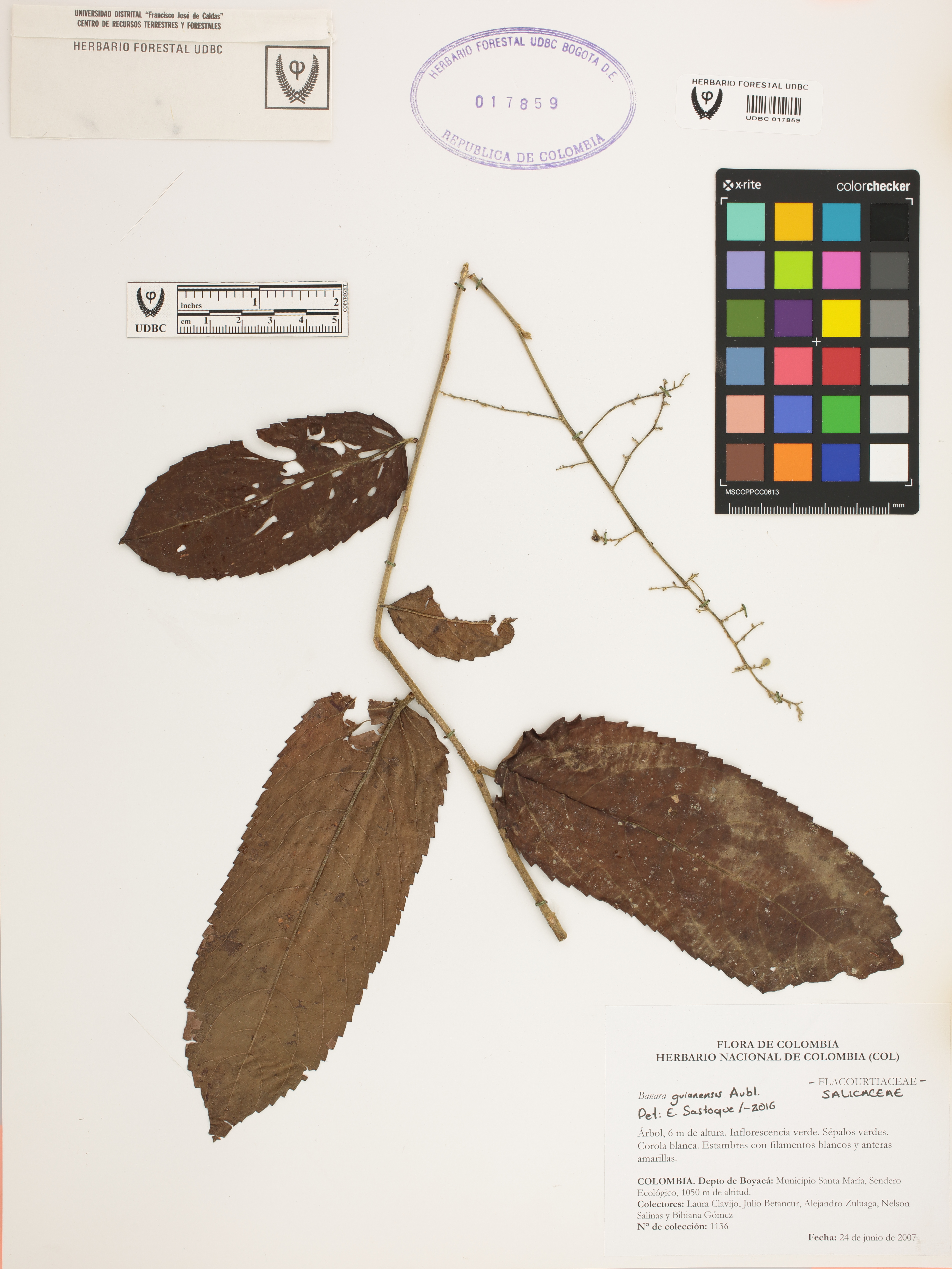Fotografía del ejemplar Clavijo, L. 1136, determinado como Banara guianensis en el año 2016