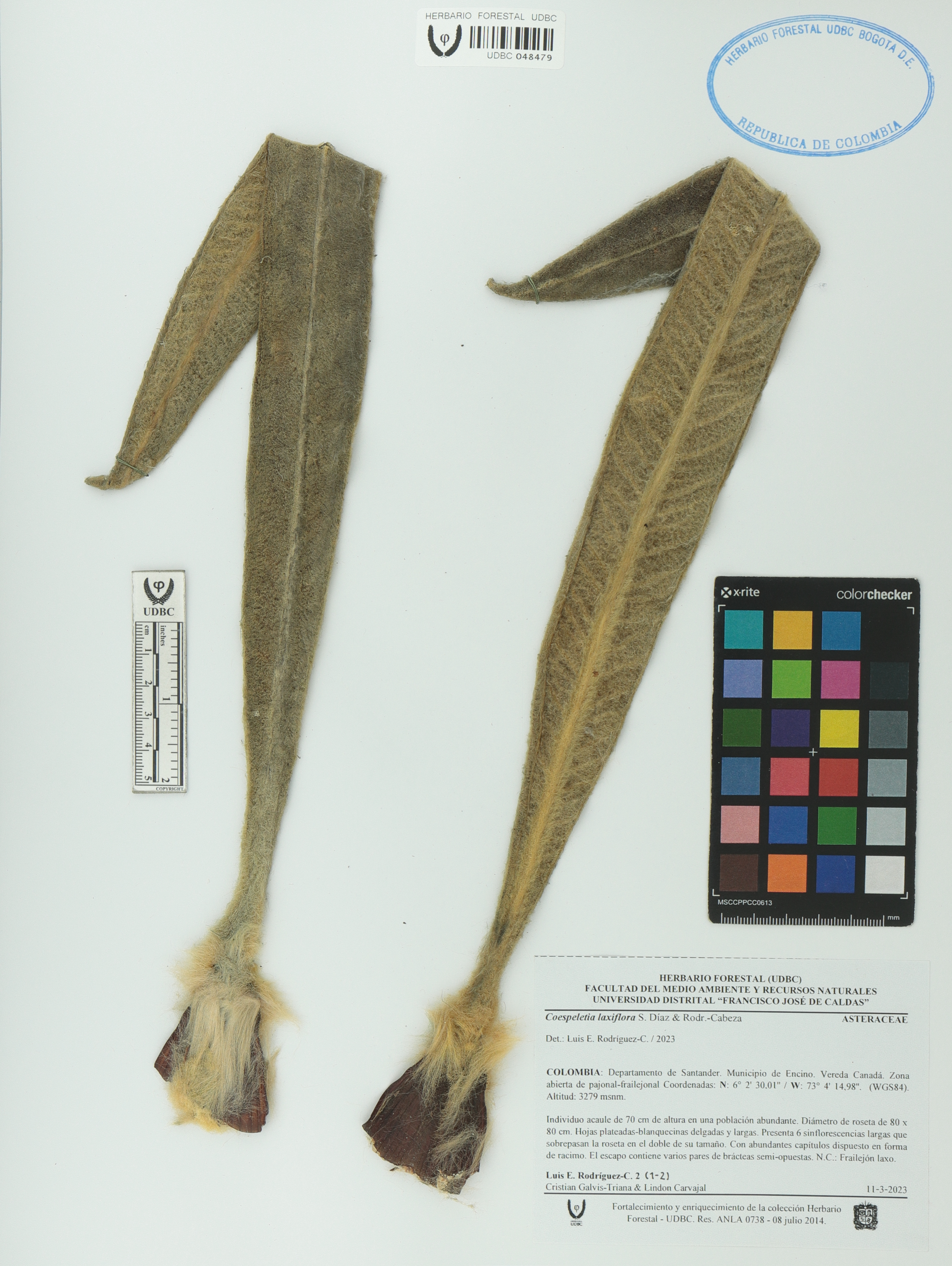 Fotografía del ejemplar Rodríguez-C., Luis 2, determinado como Coespeletia laxiflora en el año 2023